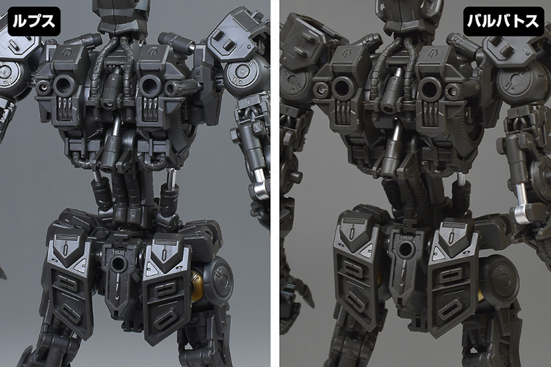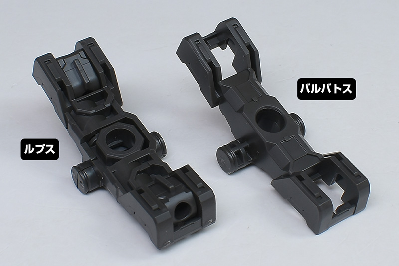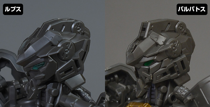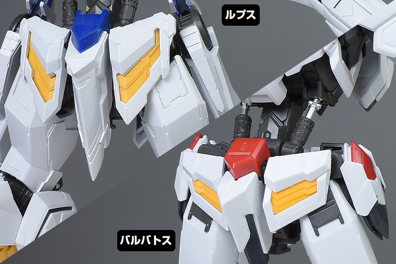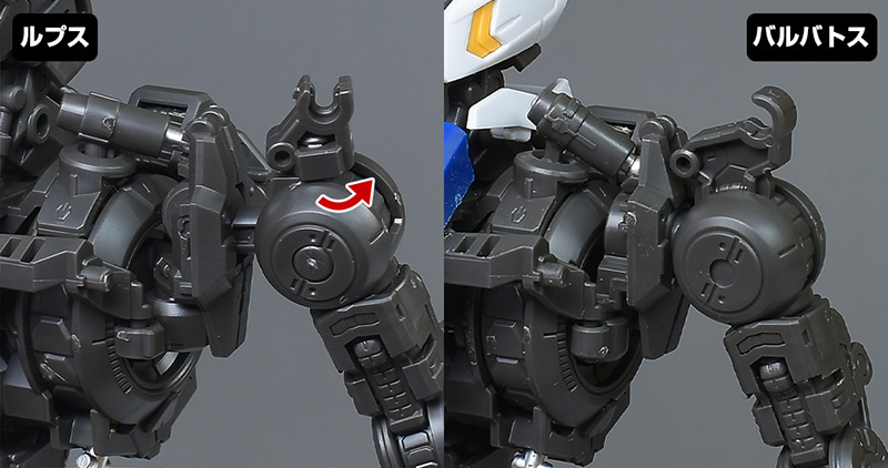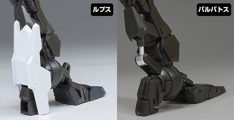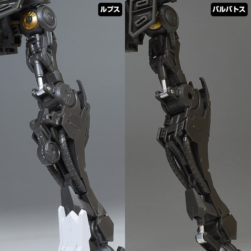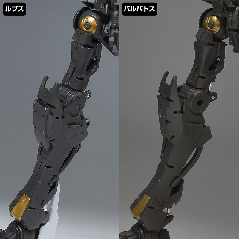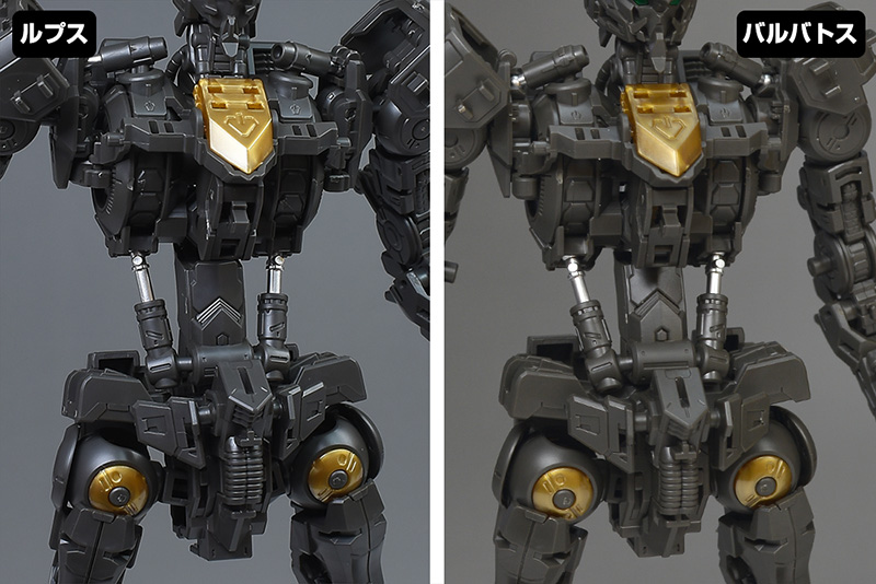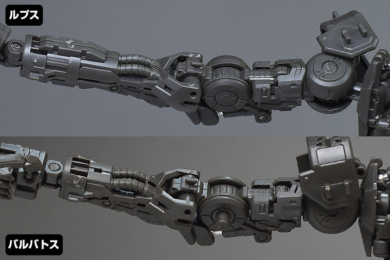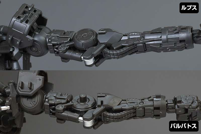 腕部内部フレームをバルバトスと並べて比較。前腕の装甲がルプス用に新造。前腕部が延長されています。