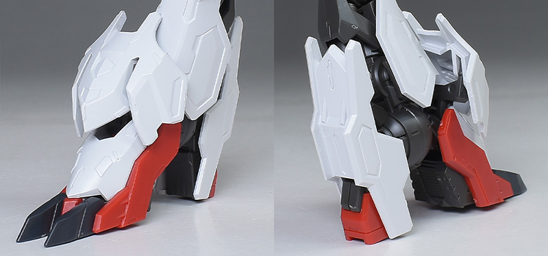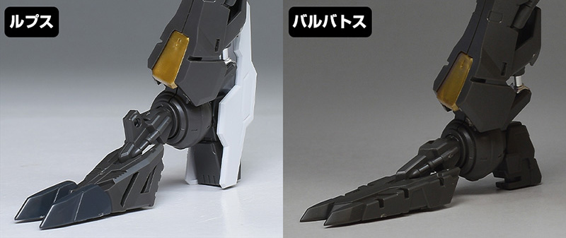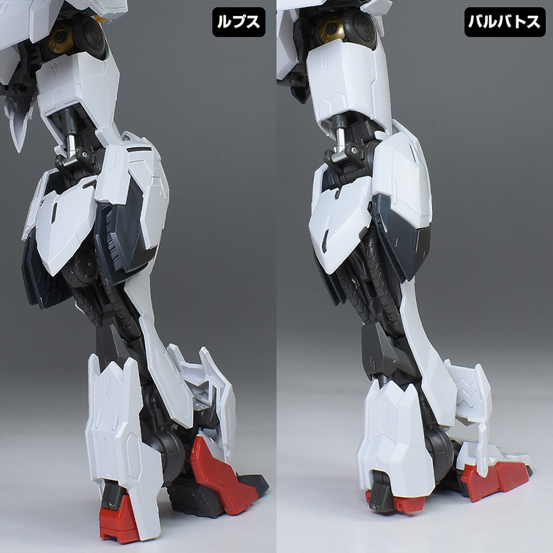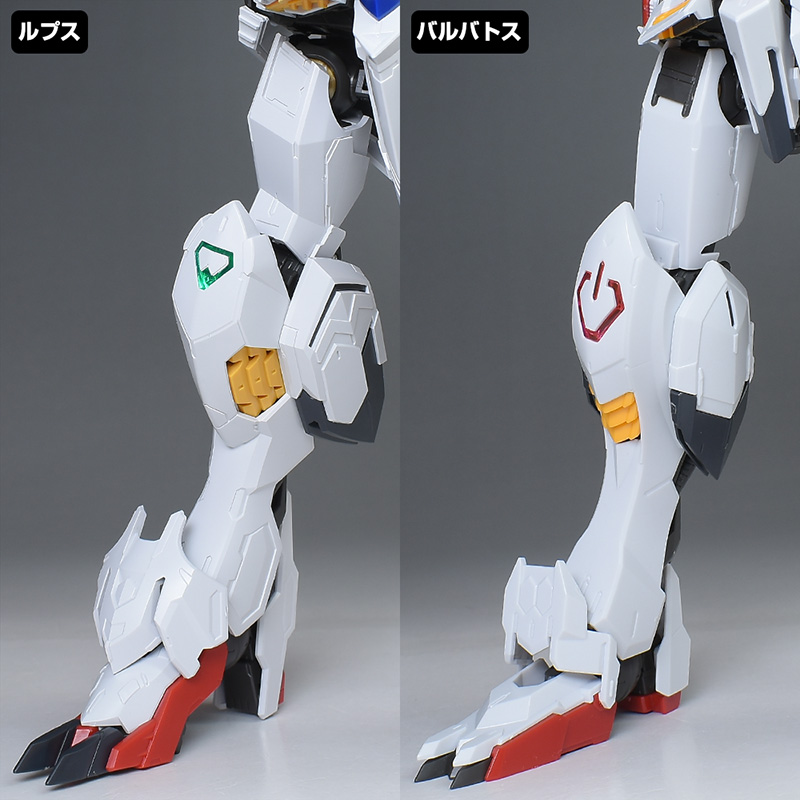 脚部をバルバトスと並べて比較。膝回りがバルバトスよりもサイズアップしてゴツみが増していますし、白い装甲は緻密なモールドで荒々しさが感じられるようになっています。膝のモールドもグリーンシールの上からクリアグリーンパーツを被せる仕様で色鮮やかに表現されています。