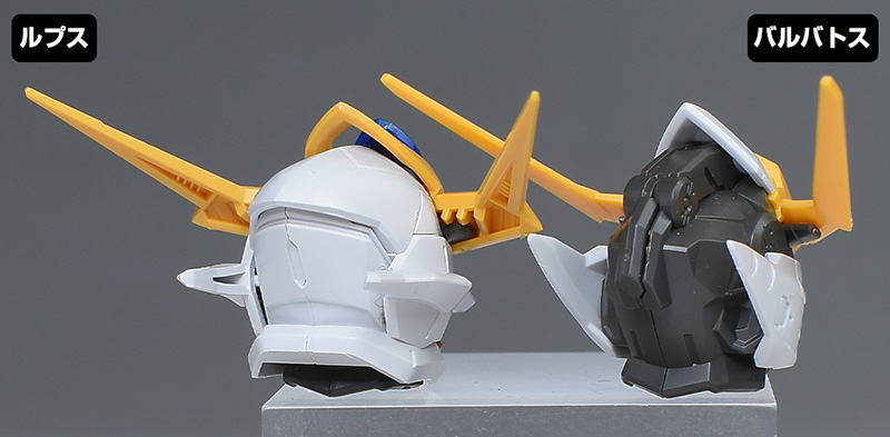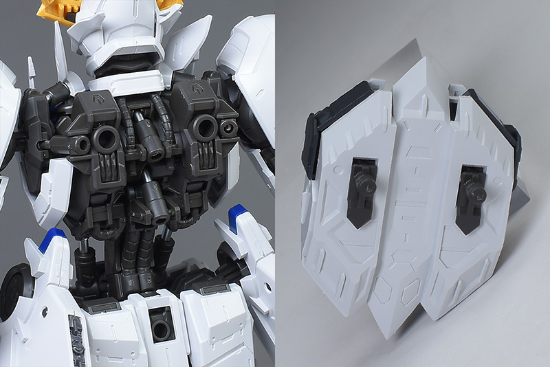 バックパックをバルバトスと並べて。形状は似ていますが、ルプスのものは六角形で左右上部に黒い装甲が造形。白い装甲も他と同様、メカニカルなモールドがデザインされています。