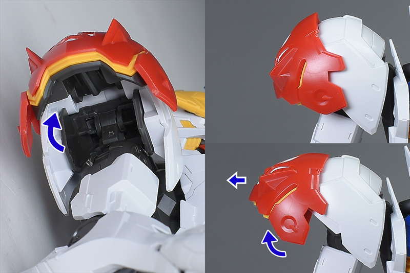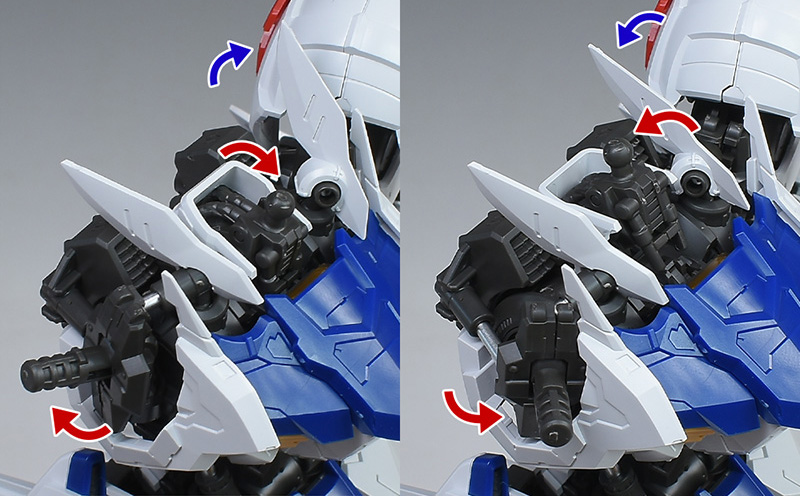 首は前後にスイング可能。肩はシリンダーシャフトによる構造で前後にスイングさせることができます。襟周りの白い装甲も頭部可動時の干渉を避けるため柔軟に可動します。