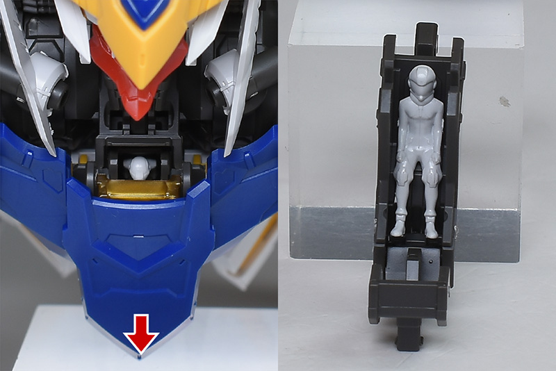 胸部の青い装甲を手前にスライドさせることでコックピットが露出。内部にはパイロットスーツ姿の三日月・オーガスフィギュアが格納されています。コックピット狭い・・・;