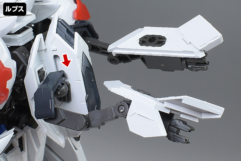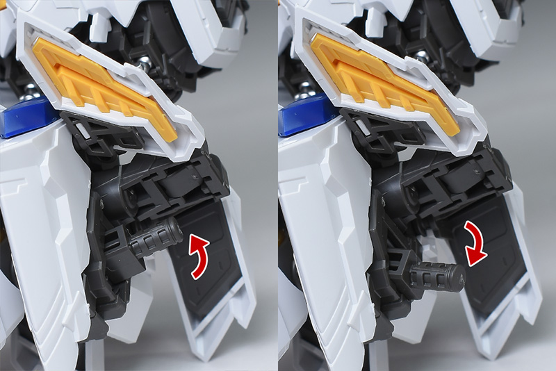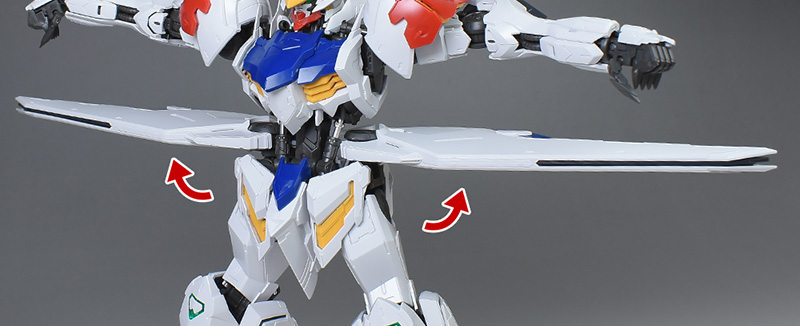 左右の装甲は展開可能。内部からアームが露出します。アームはバルバトスではシリンダーシャフト構造でしたが、抜けやすいこともあってか、全てKPSパーツによる厚みのあるアームに変化しています。アームは基部が上下にスライド可能。