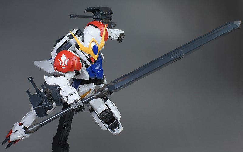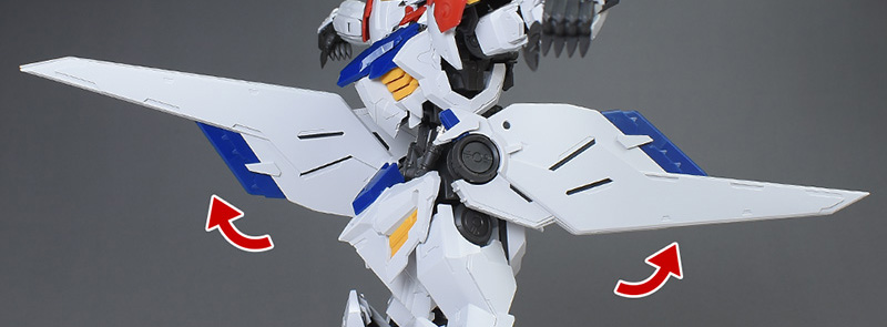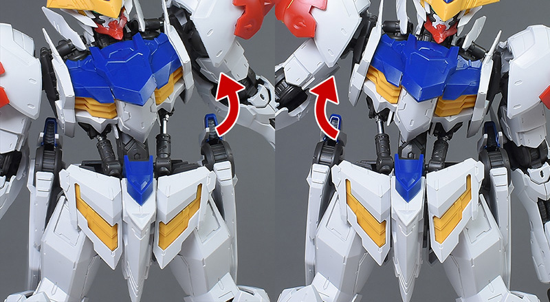 頭部は適度に上下しますし、左右への襟との干渉なく水平まで可動します。腕はバルバトス以上に可動し、水平よりも高くまで上げることが可能。アップデートされた肩フレームによってより柔軟にも可動するようになっています。肘はV字程度まで曲げることが可能。