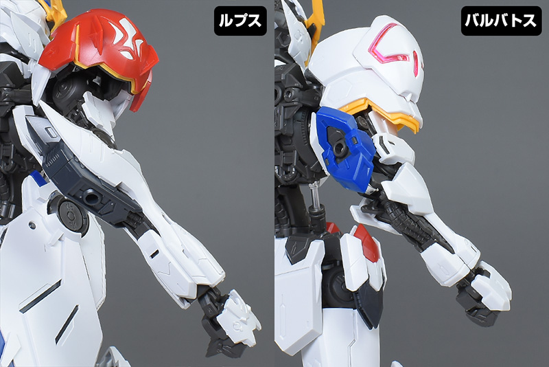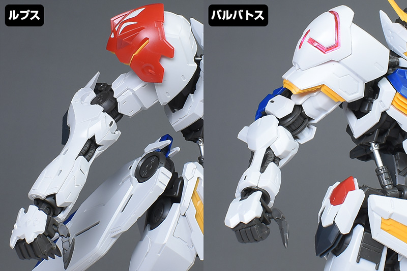 腕部をバルバトスと並べて。前腕が少し延長され、ワイルドな雰囲気が出ています。白装甲にはモールドが適度に入っていて緻密さがありますし、肩の赤装甲も存在感があって特徴的。