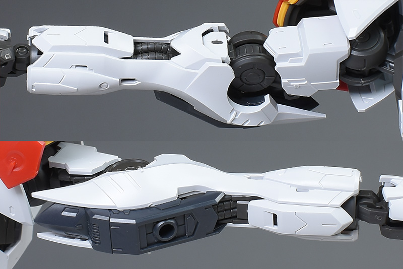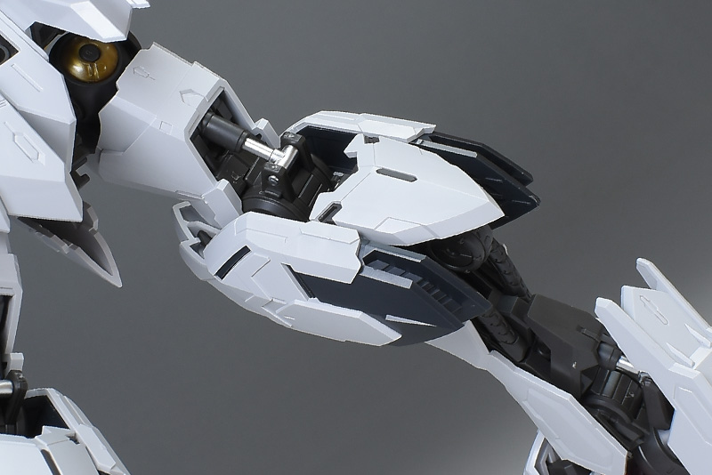 上腕、前腕共に内部フレームに外装を被せていく仕様。部分的に露出動力パイプによってメカメカしさが強調されています。前腕は左右の組み合わせで、上部に少しだけ合わせ目ができます。消す場合は後ハメなどの加工が必要。