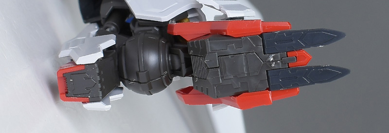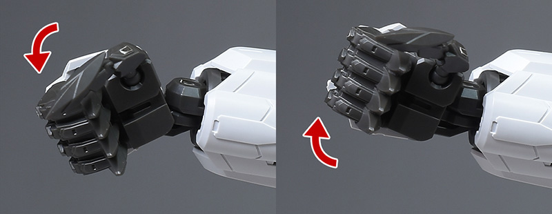 手首は多数パーツ構成によって上下にスイング可能。手首にスナップを効かせることができます。ロールももちろん可能。ハンドパーツは最近のMGで多用されている構造で、親指のみ可動し、残り4指を組み替えるタイプです。
