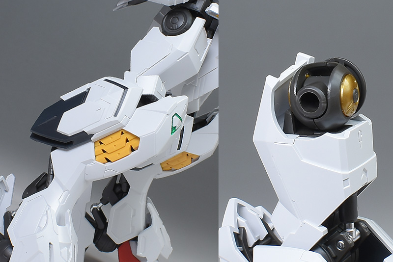 ショルダーアーマーはバルバトスと同様、丸みのあるデザインで造形。ただし側面にはルプス特有の赤い装甲を装備し、鉄華団マークやワンポイントのイエローモールドもパーツできっちりと色分けされています。