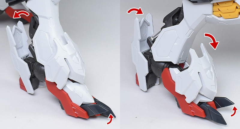 足首は前後に幅広く可動しますし、アンクルアーマーも足首の可動に追随するように幅広く前後します。かかとも適度に前後可動し、表情を変化させることが可能。爪は左右個別に上下しますし、踵も前後にスイング可能。ソール部にもギミックが詰まっています。