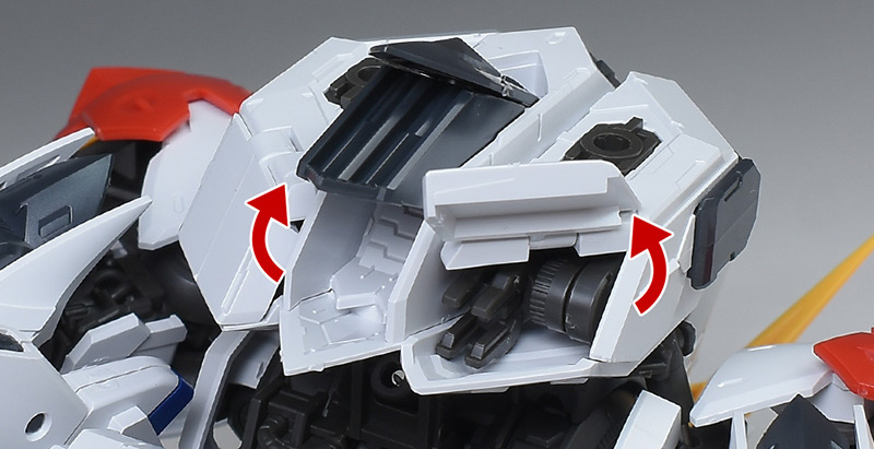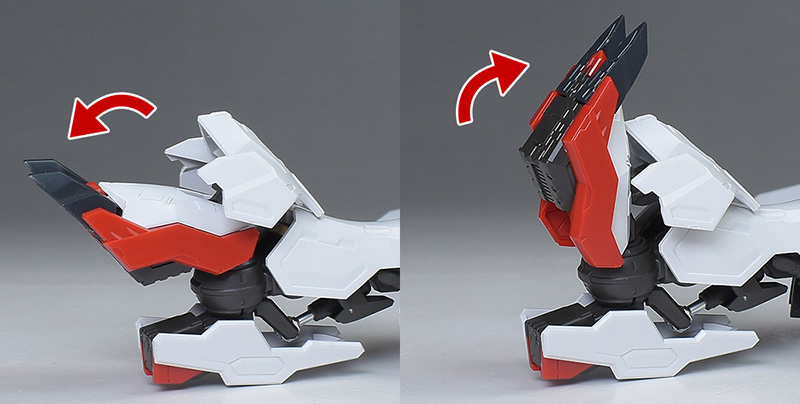ショルダーアーマーはヒンジ接続で上方に展開できますし、赤い装甲は少し引き出すことで上下に可動。展開することで放熱状態を再現することができます。