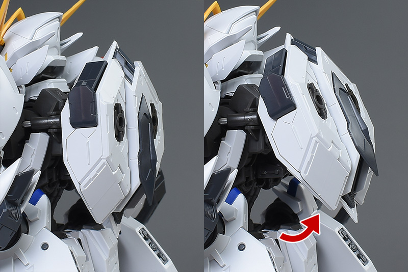 肩部もMGガンダムヴィダールでアップデートされた構造で、ショルダーアーマーのジョイント基部がロール可能。腕部可動時の干渉が避けられるようになっています。