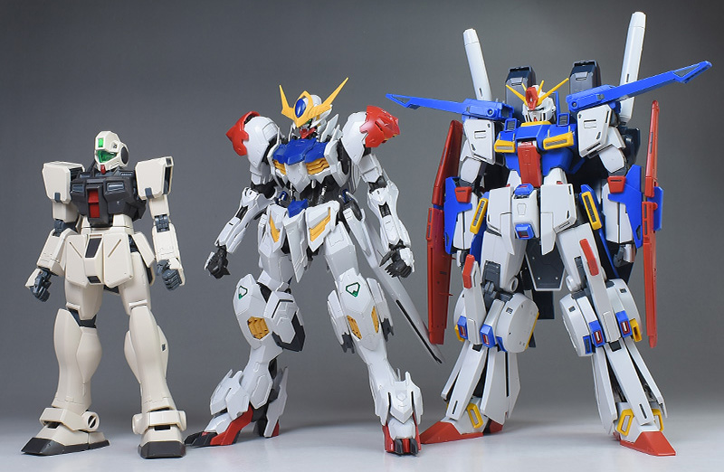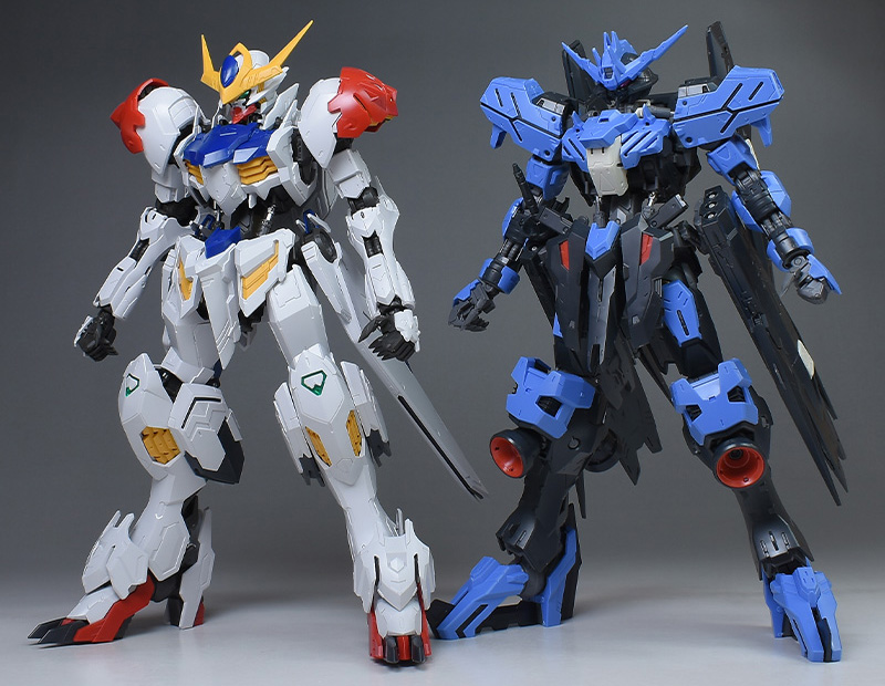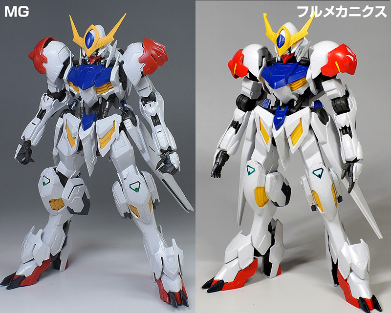 別画像ですが1/100 フルメカニクス ガンダムバルバトスルプスと並べて比較。フルメカニクスはHGを1/100サイズにしたようなディテールですが、MGはかなりモールドが多く緻密さと力強さが感じられるようになっています。