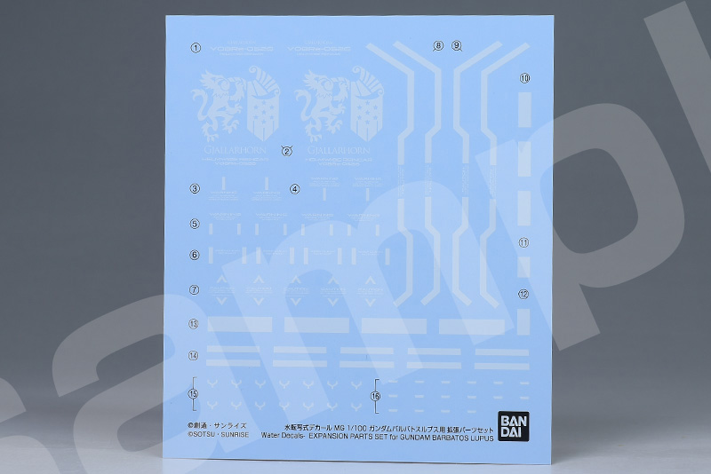 専用の水転写デカールが付属。ヴァルキュリアバスターソード、腕部ロケット砲用の各部コーションマークが収録されています。ギャラルホルンエンブレムも収録。