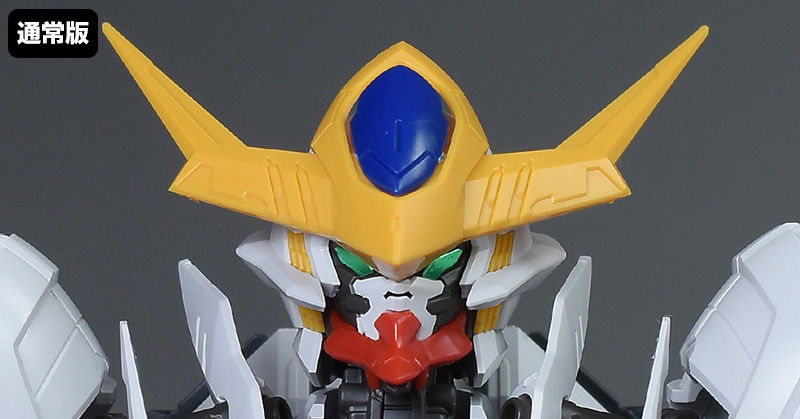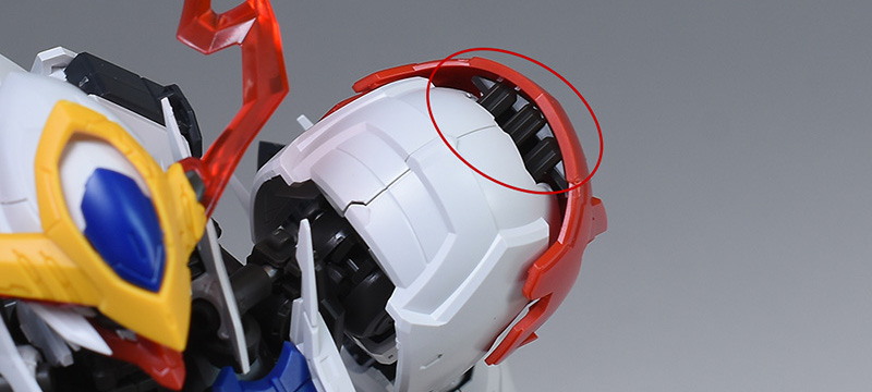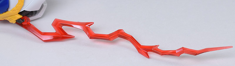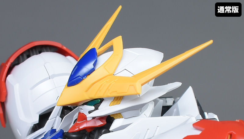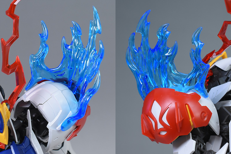 破損頭部再現パーツと眼光エフェクト再現パーツを使った頭部と通常版のルプス頭部を比較して。ツインアイが劇中シーンのような赤眼に変わっている他、左側頭部の外装がなく、ツインアイから流れる稲妻状の眼光エフェクトパーツが印象的に造形されています。戦闘時の荒々しい雰囲気が強調されていますね。