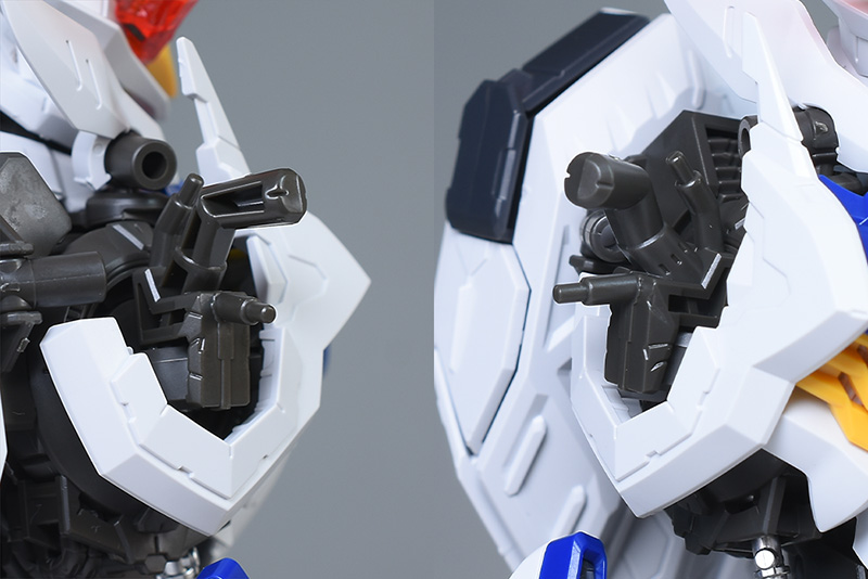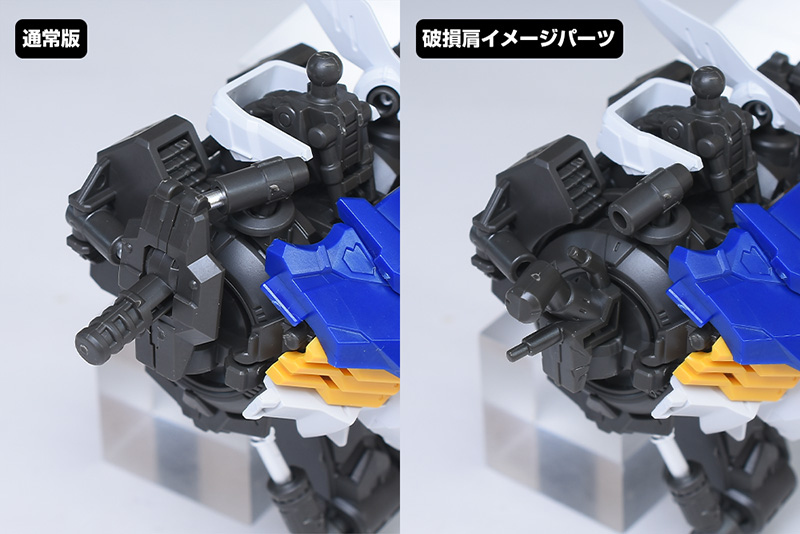 通常のルプス肩部と破損イメージパーツを組み付けた状態の肩部を並べて比較。組み立て後のルプスをこの状態にする場合、頭部と腕部、下半身以下、バックパックを取り外し、肩と脇の外装を取り外すだけで組み換えができます。