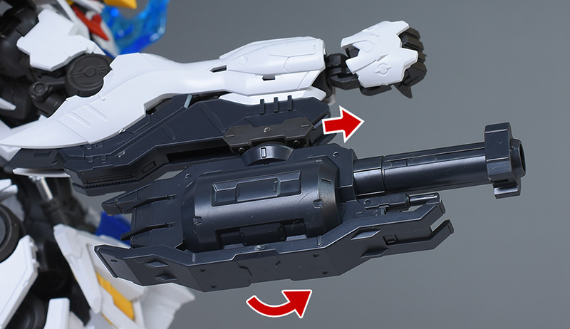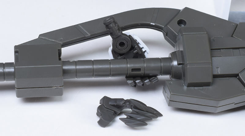 腕部200mm砲の基部パーツを組み替えて前腕に装備します。パチンと組み付けられて固定強度は高め。