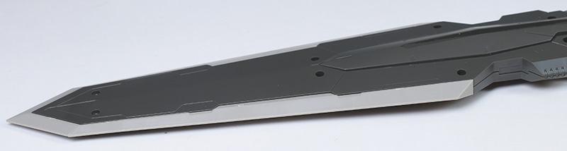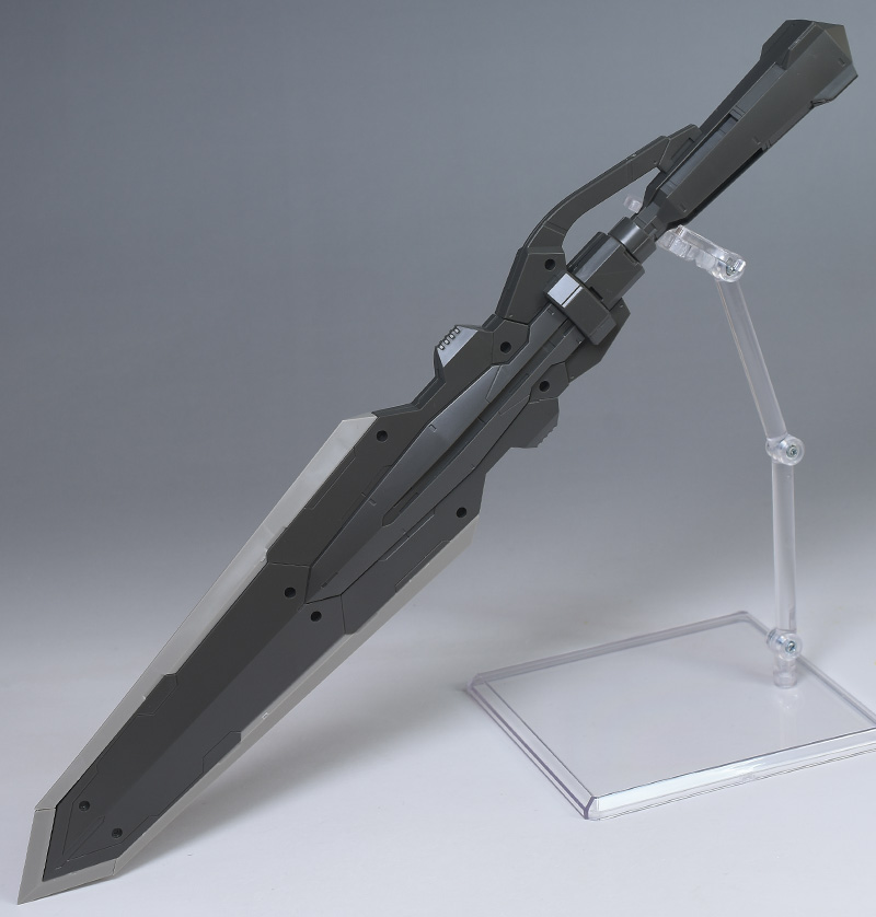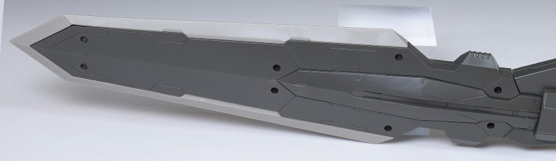 大剣部分は基部が2枚パーツ構成。表面数カ所にはモールドを兼ね合いの3.0mm穴が造形されており、付属のスタンドでディスプレイ時に支えることができます。