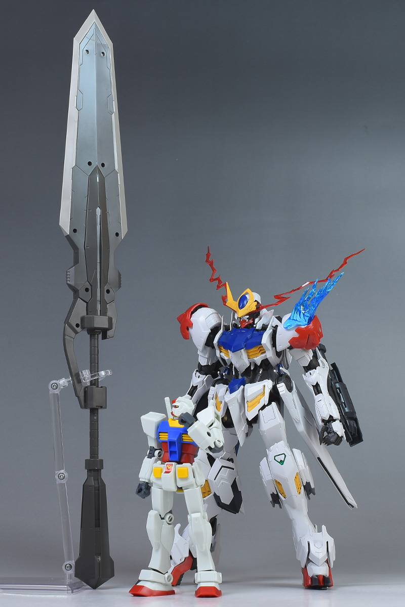 MGガンダムバルバトスルプス、HGUC RX-78-2ガンダムと並べて大きさを確認。MG2体分ほどの長さがあります。HGに比べると4倍程度の長さ。最近のガンプラは大型キットが多いため、ディスプレイスペースには悩ませられそうですね;ちなみにヴァルキュリアバスターソードの全長は40cm(延長時)です。