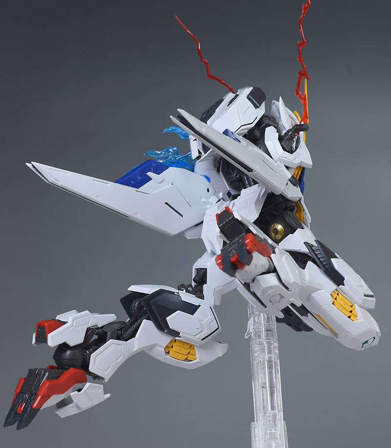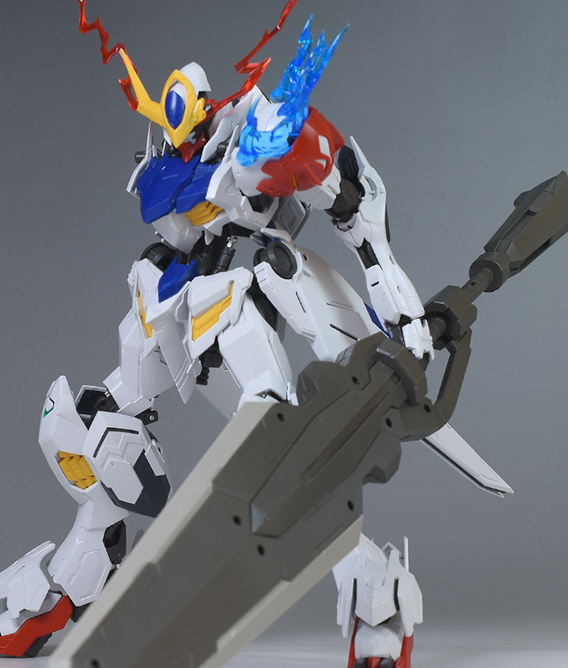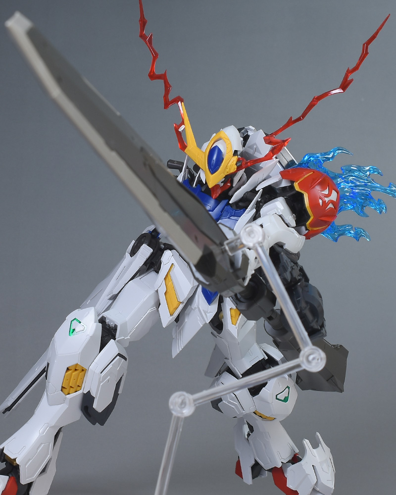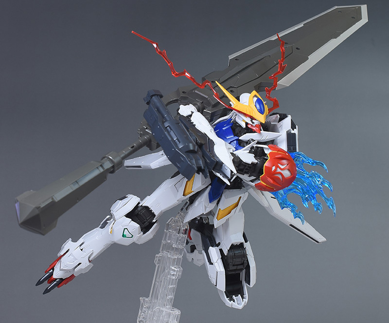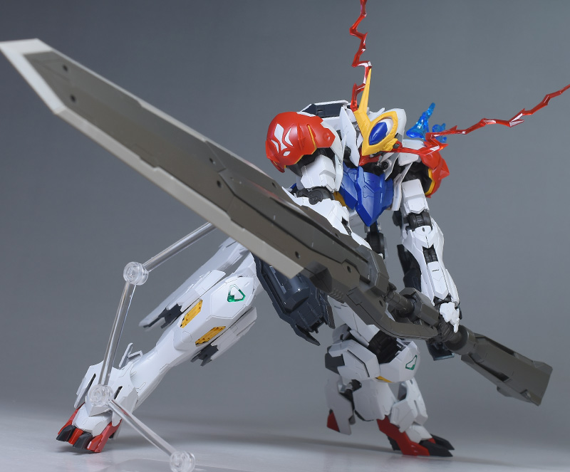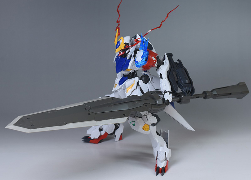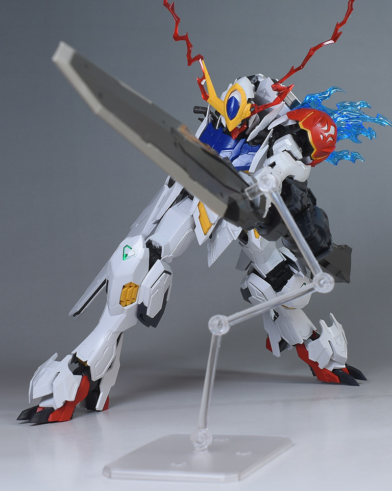 気になる点は、肩破損パーツが1個パーツ構成で肉抜き穴が少し気になるのと、ヴァルキュリアバスターソードに重さがあるため、どうしても構えると腕が垂れやすくなります。超大型武装なので当然ではありますが、関節が細身のバルバトス系にあって、無理なポーズを取らせると破損に繋がることも多いので注意が必要です。