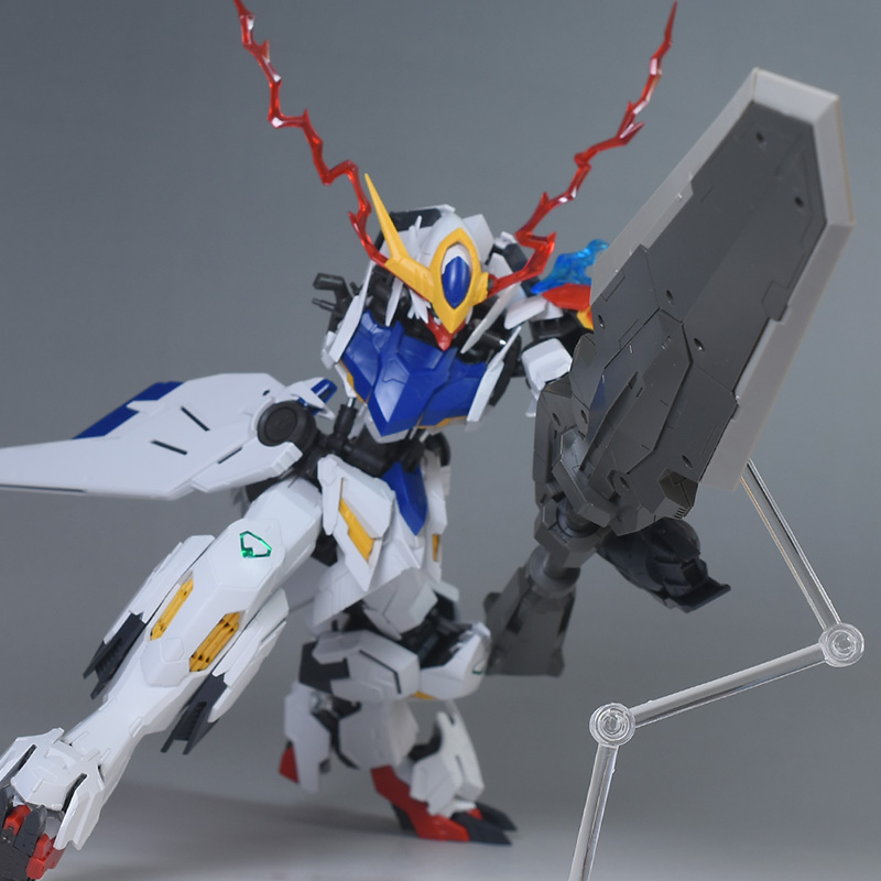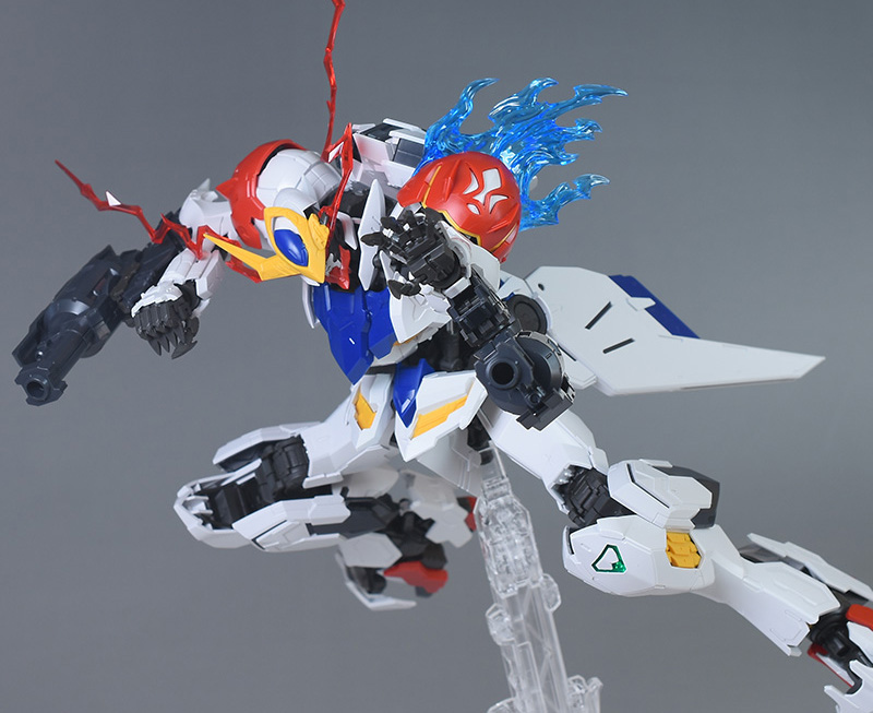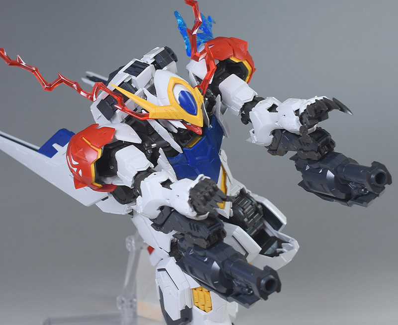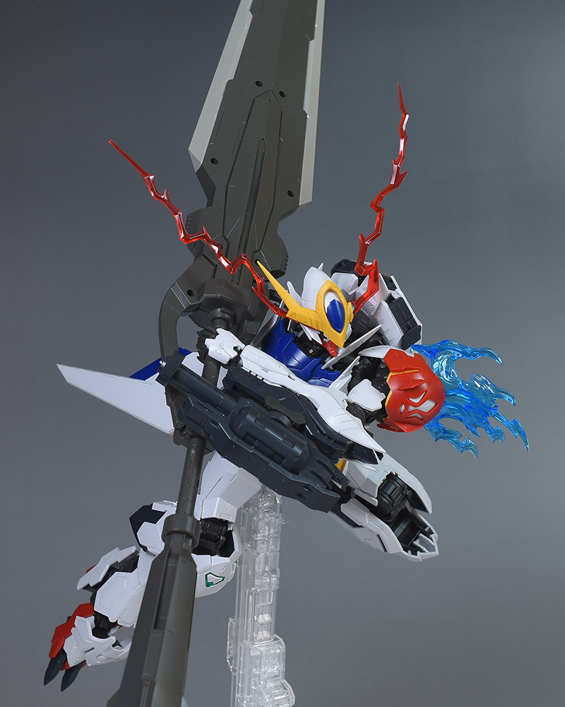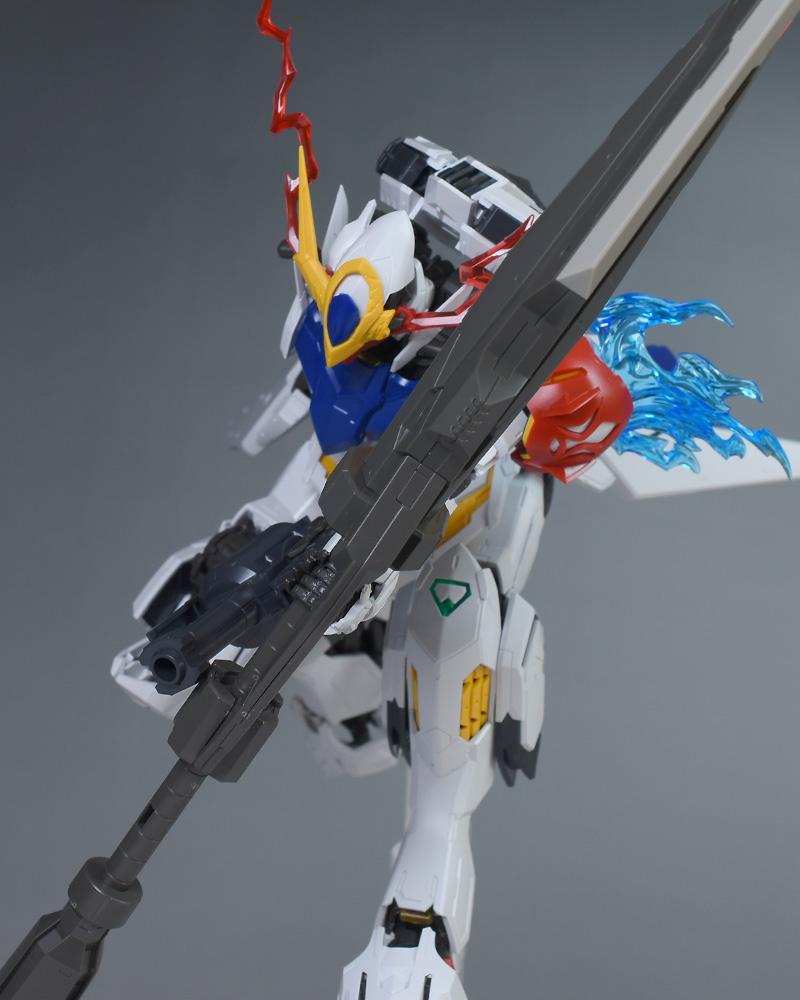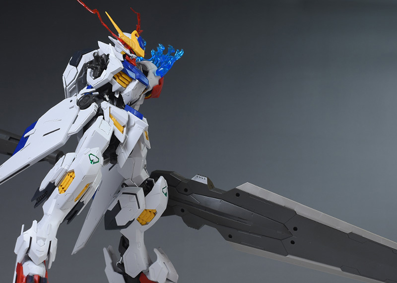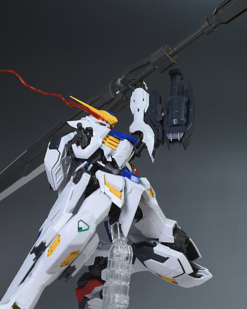気になる点は、肩破損パーツが1個パーツ構成で肉抜き穴が少し気になるのと、ヴァルキュリアバスターソードに重さがあるため、どうしても構えると腕が垂れやすくなります。超大型武装なので当然ではありますが、関節が細身のバルバトス系にあって、無理なポーズを取らせると破損に繋がることも多いので注意が必要です。