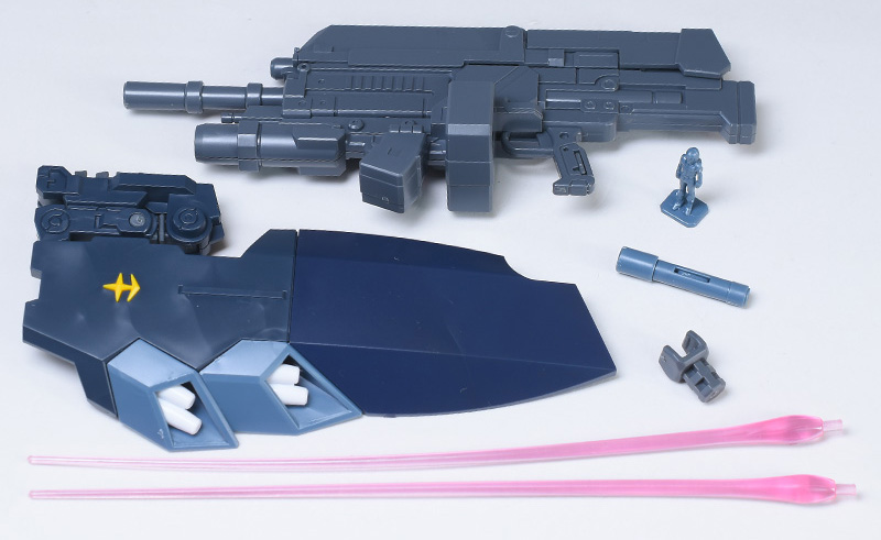 ビーム・ライフル、シールド、ディスプレイ用ジョイントパーツ、ビーム・サーベル(ビーム刃、サーベル柄)、連邦軍パイロットのフィギュアが付属。ビーム・サーベル刃は1本余剰です。