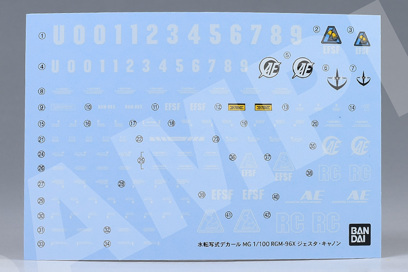 専用の水転写デカールが付属。ナンバーマーキングの他、連邦、ロンド・ベル、ラー・カイラム、アナハイム・エレクトロニクス社などのマーキングが収録されています。