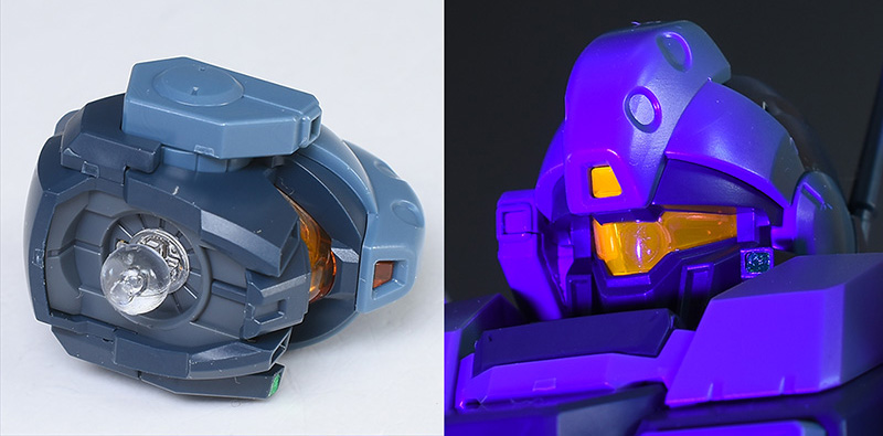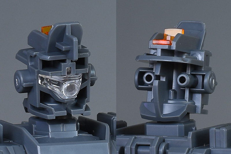首はボールジョイント型のクリアパーツでの再現で、胸部に組み込むLEDユニットの光を頭部に伝えられるようになっています。バイザーはクリアオレンジ成形色での再現で、ブラックライトで照らすと適度に発光します。