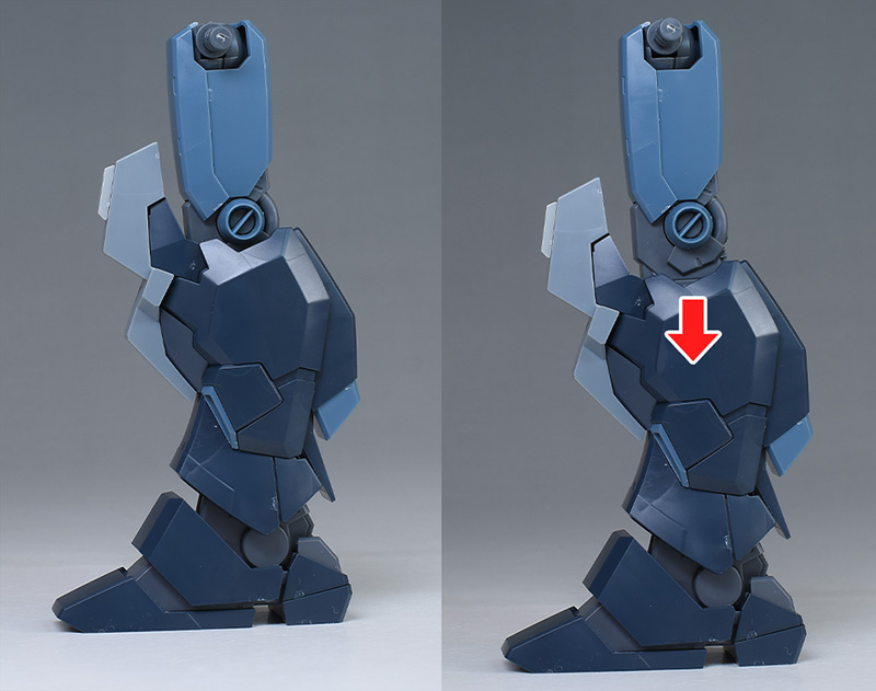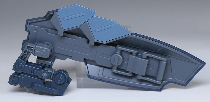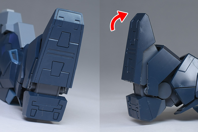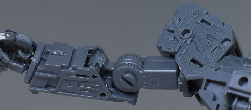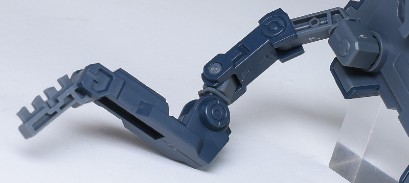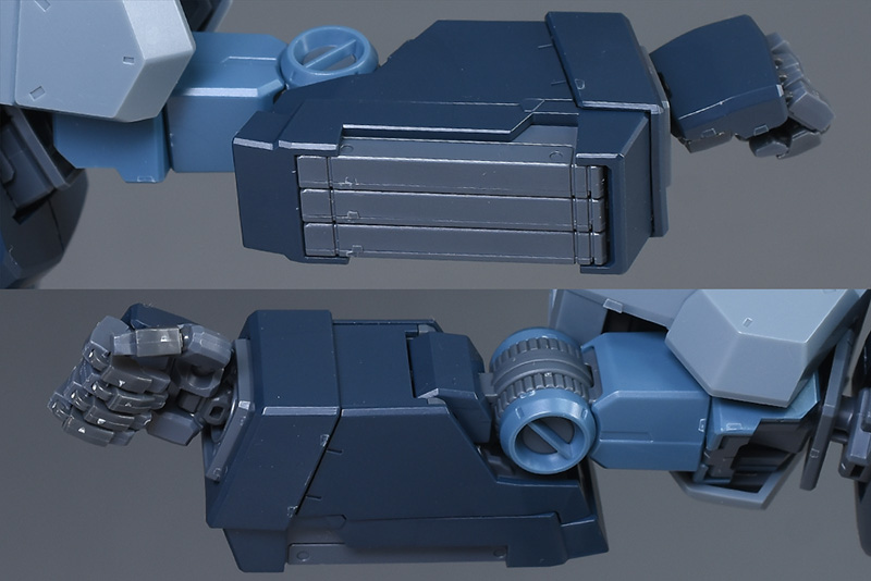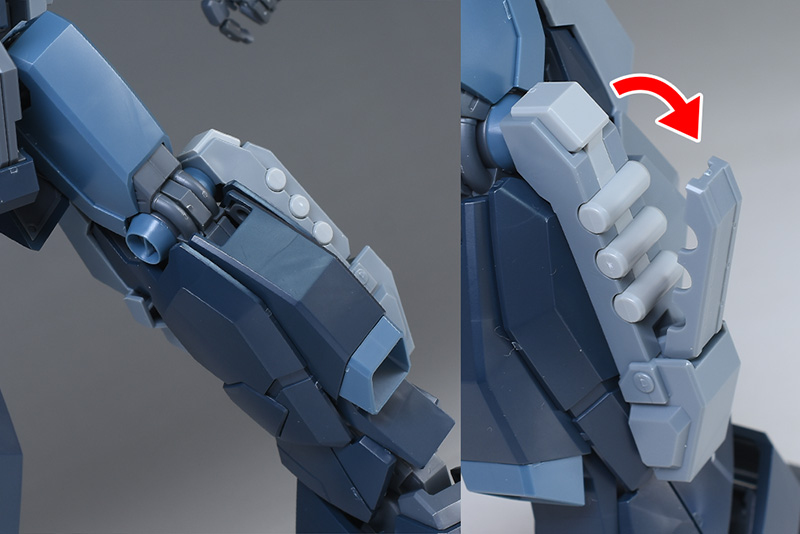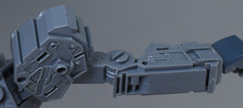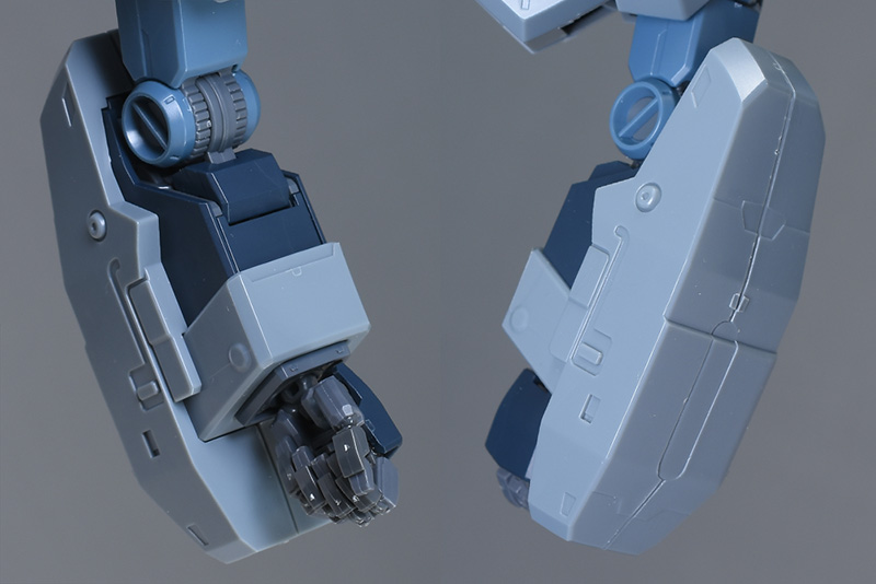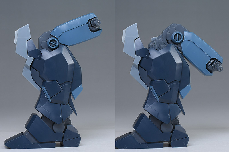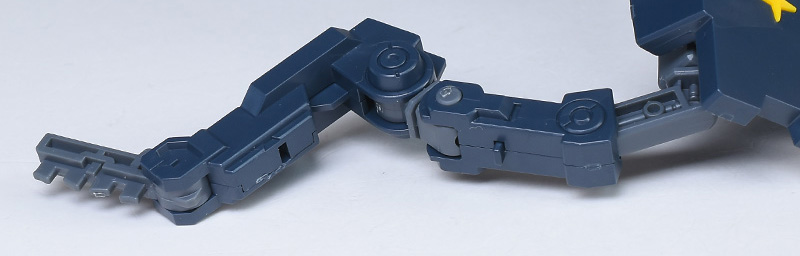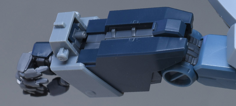 アームも可動箇所が多く、各部が細かく可動します。これによってシールドを様々な位置に配置したり向きを変えたりできるようになっています。ダークブルーの装甲部分は左右の組み合わせ。合わせ目か段落ちモールドか判断が難しいところです。