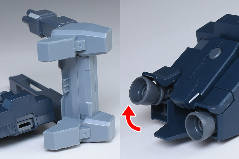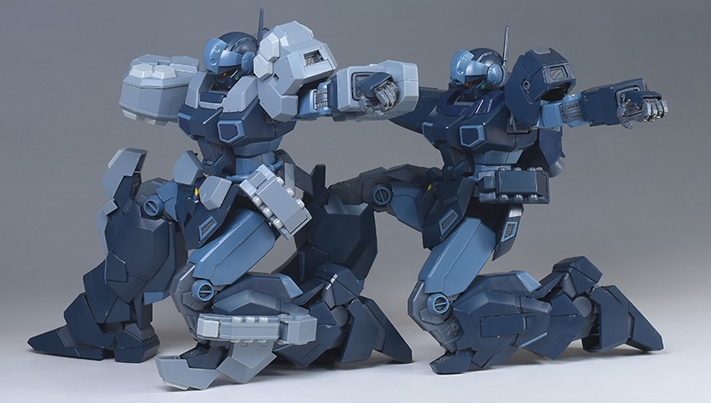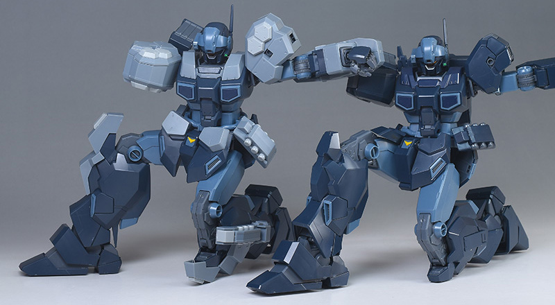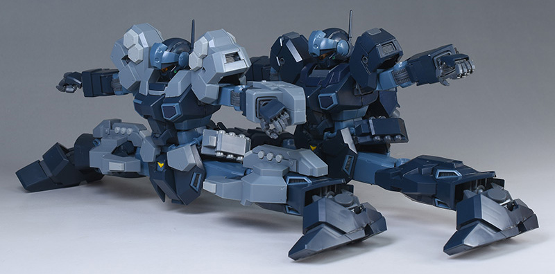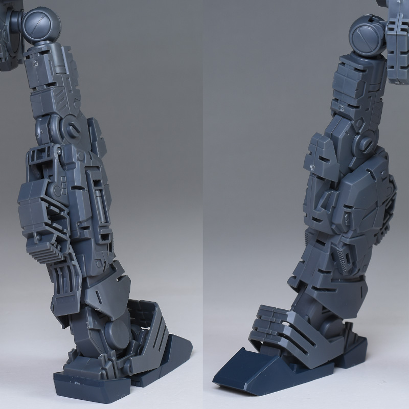 脚部をジェスタと並べて比較。こちらも大部分はジェスタと同じですが、膝から下には3連装グレネード・ランチャーを持つ増加装甲を装備。重厚感ある容姿に変化しています。