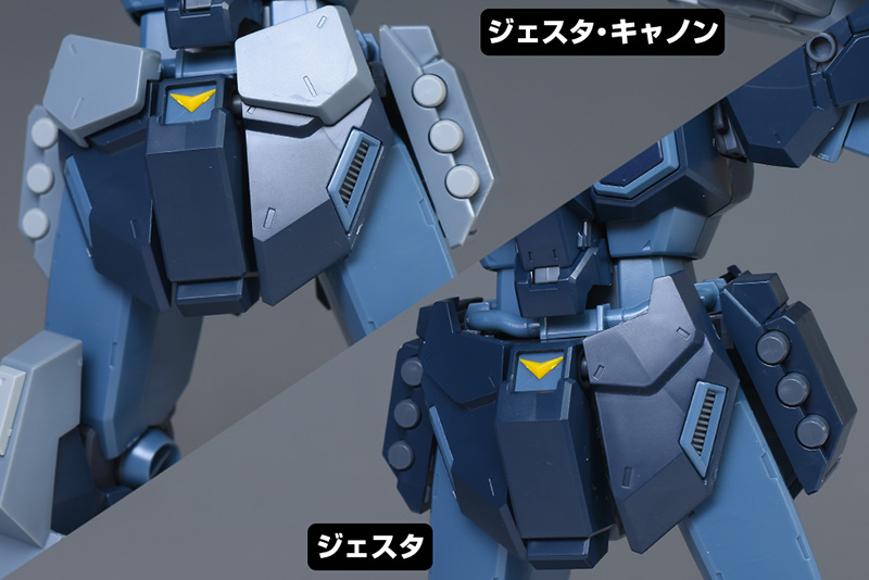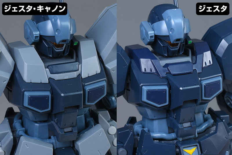 胴体部をジェスタと比較して。大部分の形状は同じですが、襟にはジェスタ・キャノン用の増加装甲が新造。ややボリューム感ある容姿に変化しています。