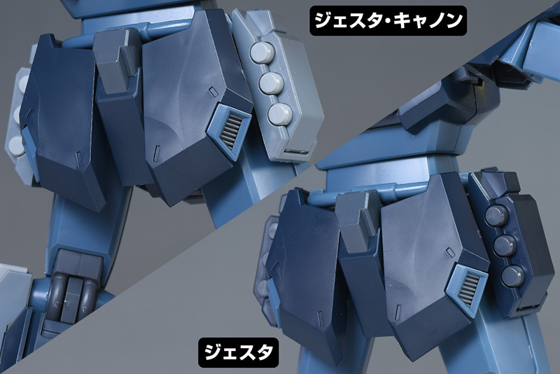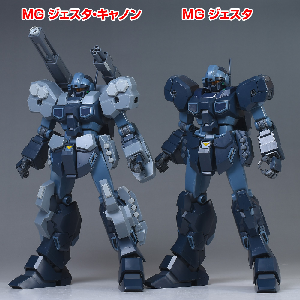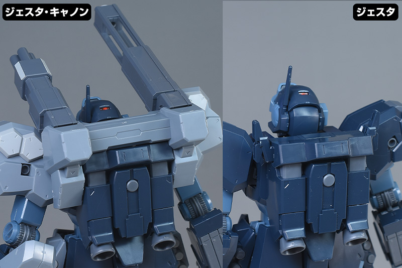 HGUC ジェスタ・キャノンとサイズを合わせて比較。一見するとデザインに差はないように見えますが、ショルダーアーマーの形状が少し違っていたり、脚の付け根の構造(色分け)が違っていたりしています。プロポーションが良く見えるのはHGUCですが、MGは細部が緻密ですし、大型キットなので重厚感がスゴイです。