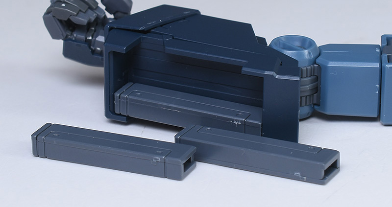 脚部もフレームに外装を細かく組み合わせていく構造で合わせ目はありません。脹脛の3連装グレネード・ランチャーはハッチが展開可能。グレネード自体は特にパーツ分割されておらず、個別に取り出すことはできません。外装パーツと一体なので、バラす場合も細かな改修が必要そうですね。