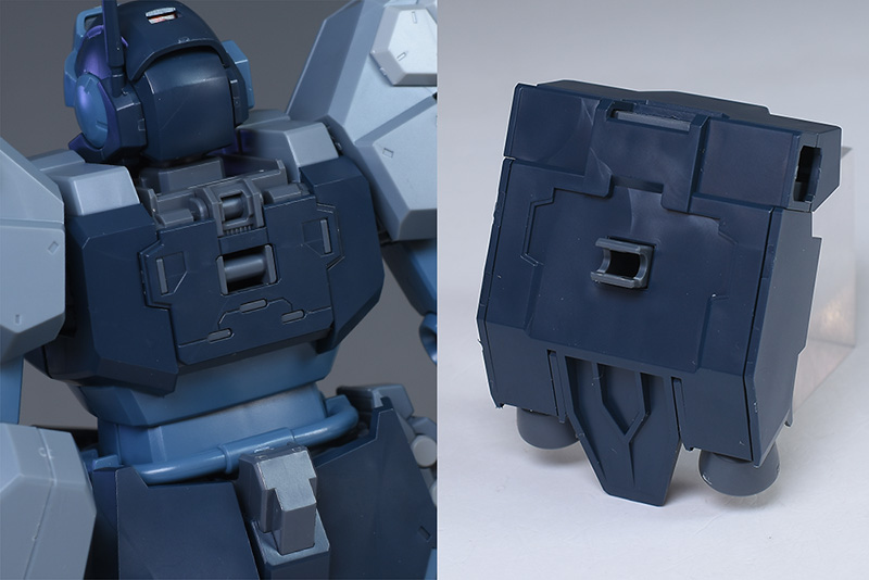バックパックをジェスタと比較して。バックパック本体の形状は同じですが、左右のマウントラッチがオミット。上部にはジェスタ・キャノン特有のビーム・キャノンと4連マルチ・ランチャーを装備しています。上部装備は新規造形での再現。