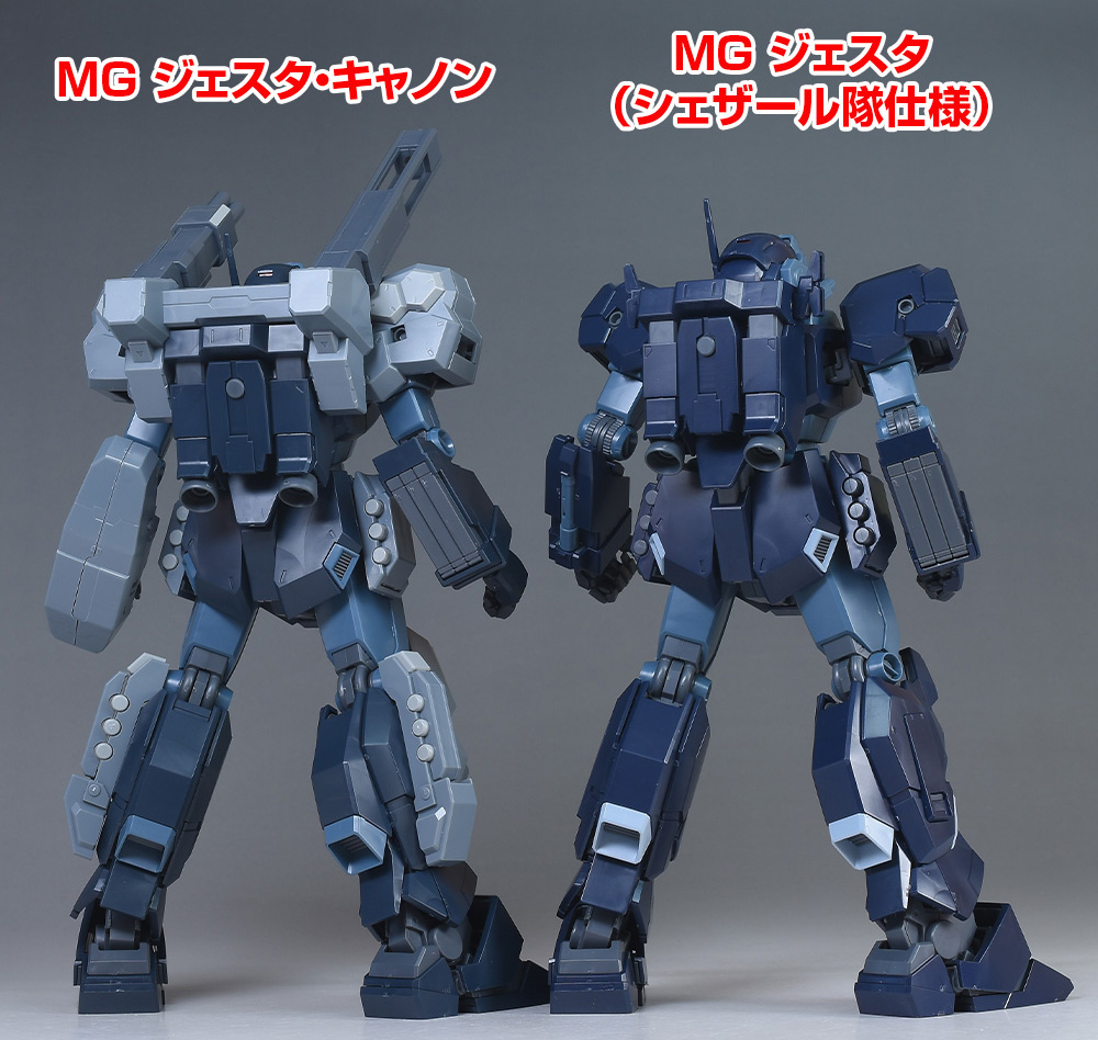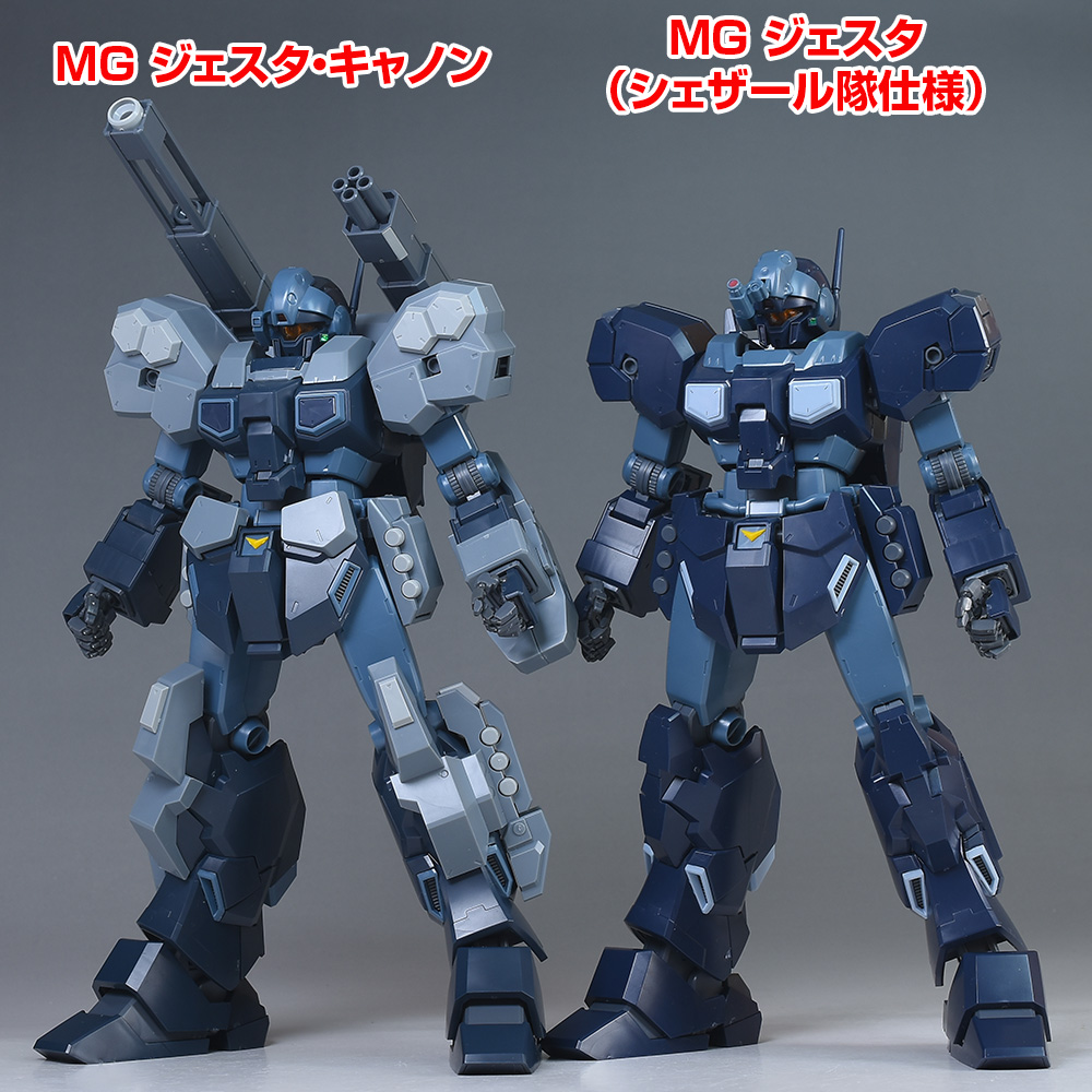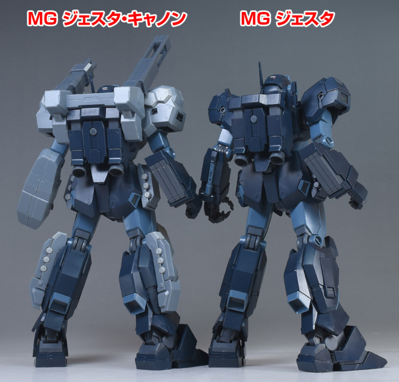MG ジェスタと並べて比較。ジェスタ本体の成形色は同じ。各部の増加装甲がライトグレーなので、そのぶん、ジェスタ・キャノンのほうが全体的に少し華やかな感じがありますね。