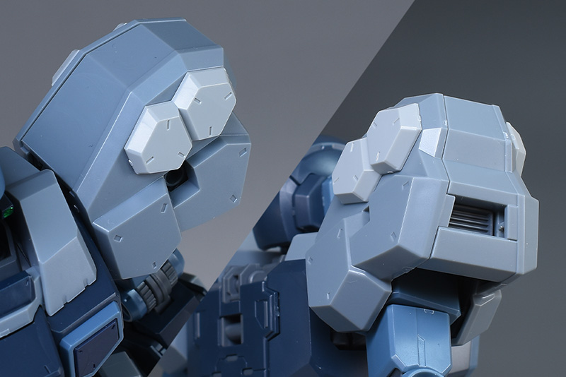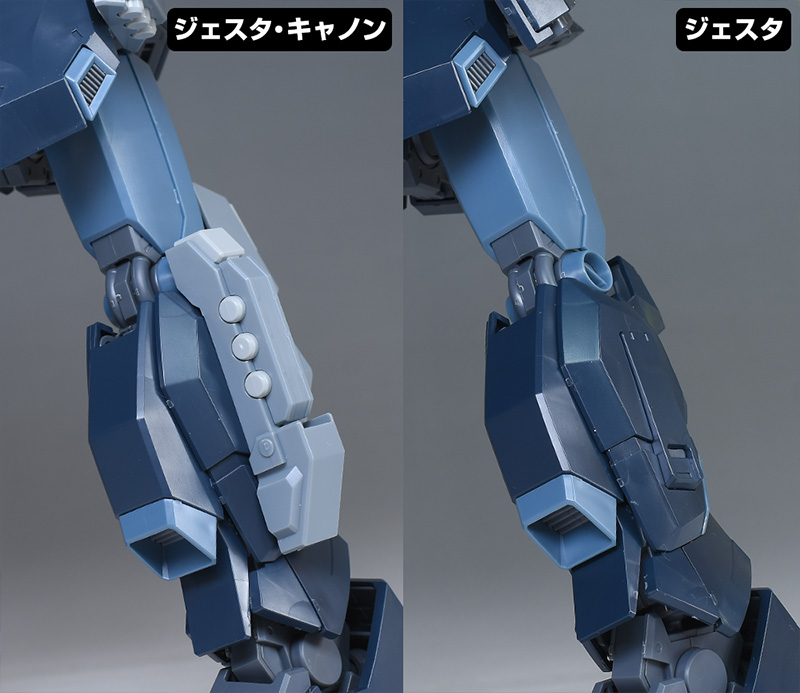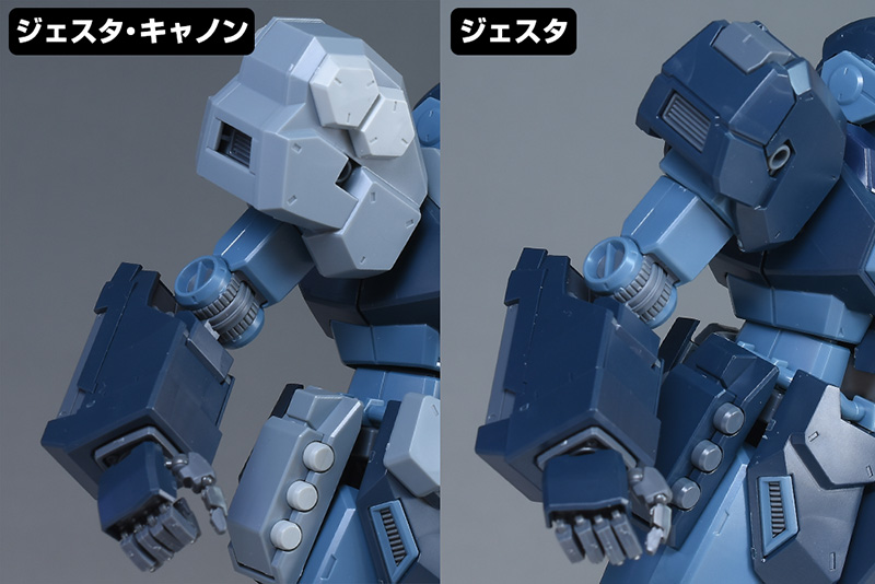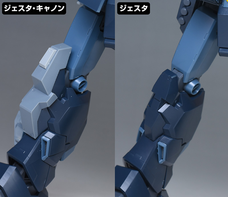 右腕部をジェスタと比較して。上腕以下はジェスタと同じ。ショルダーアーマーのみ、ボリューミーな増加装甲を装備したことで重厚感が増しています。