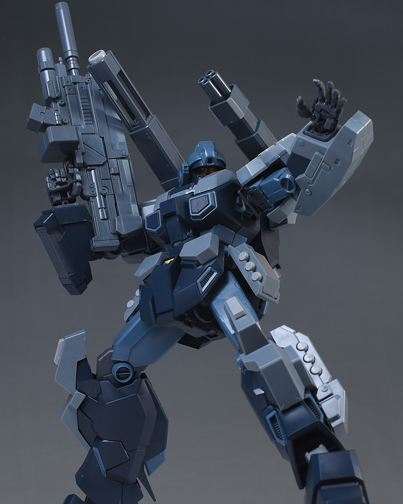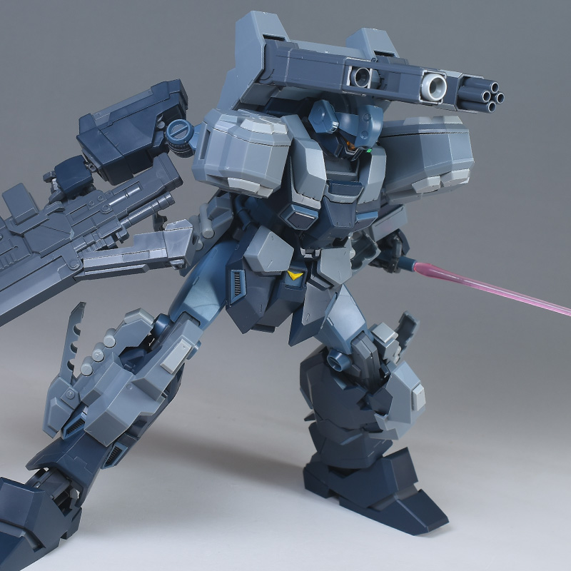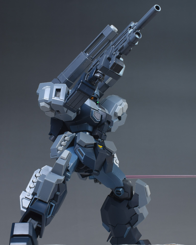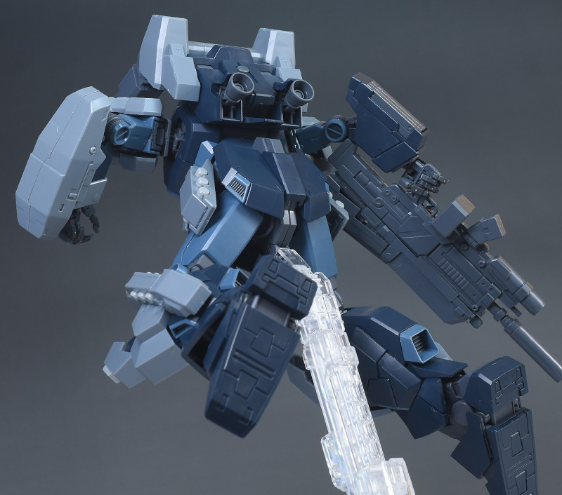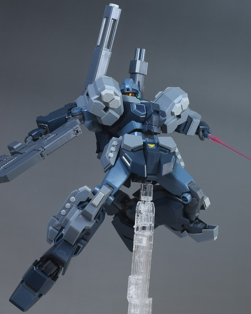 MGの中でも比較的大きめのキットなのと、各部増加装甲や肉厚のビーム・ライフルを装備しているため、シンプルにポーズを付けて飾るだけでもバツグンの存在感を発揮します。ジェスタと同様、ミリタリー要素も強く、特殊部隊感がうまく表現されていて良いですね。