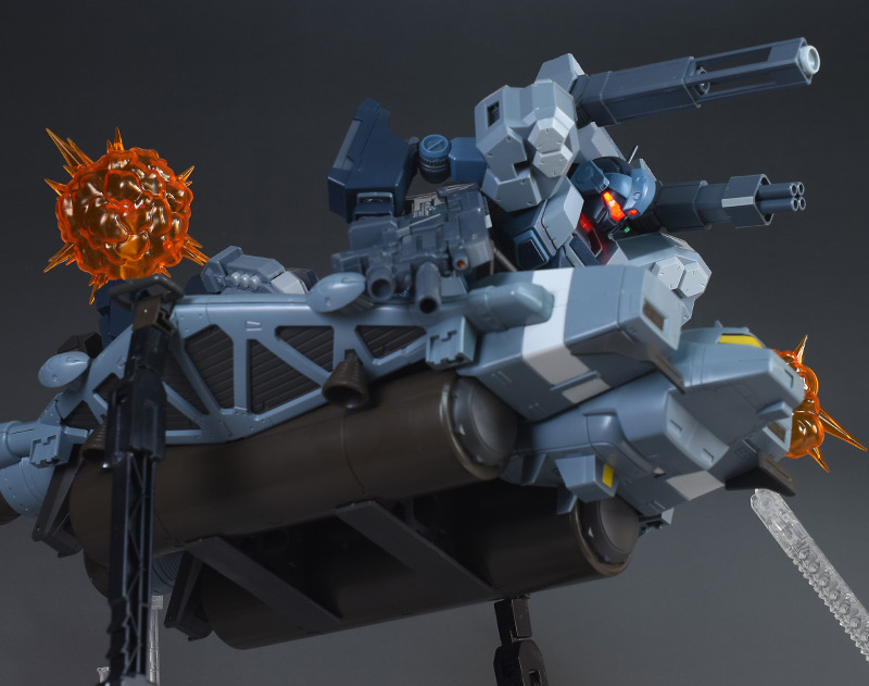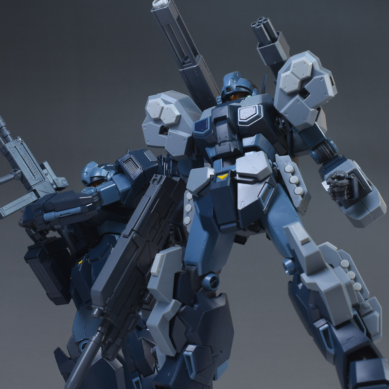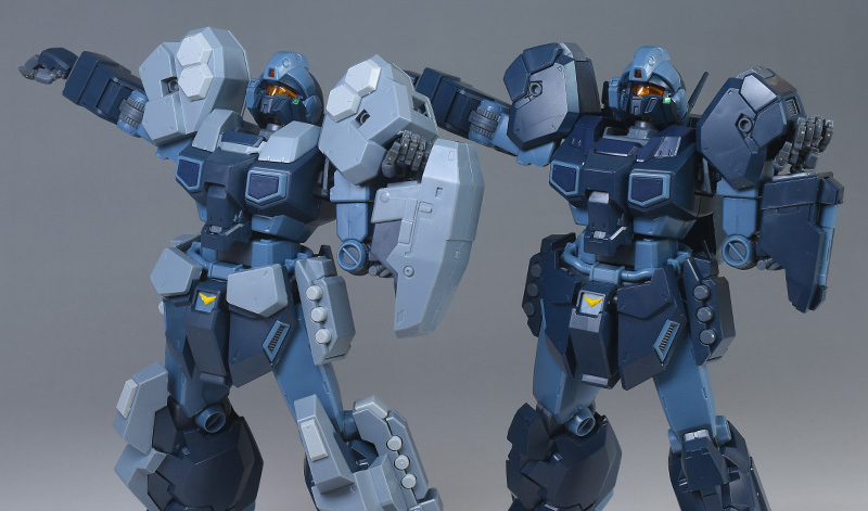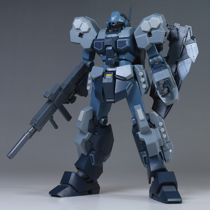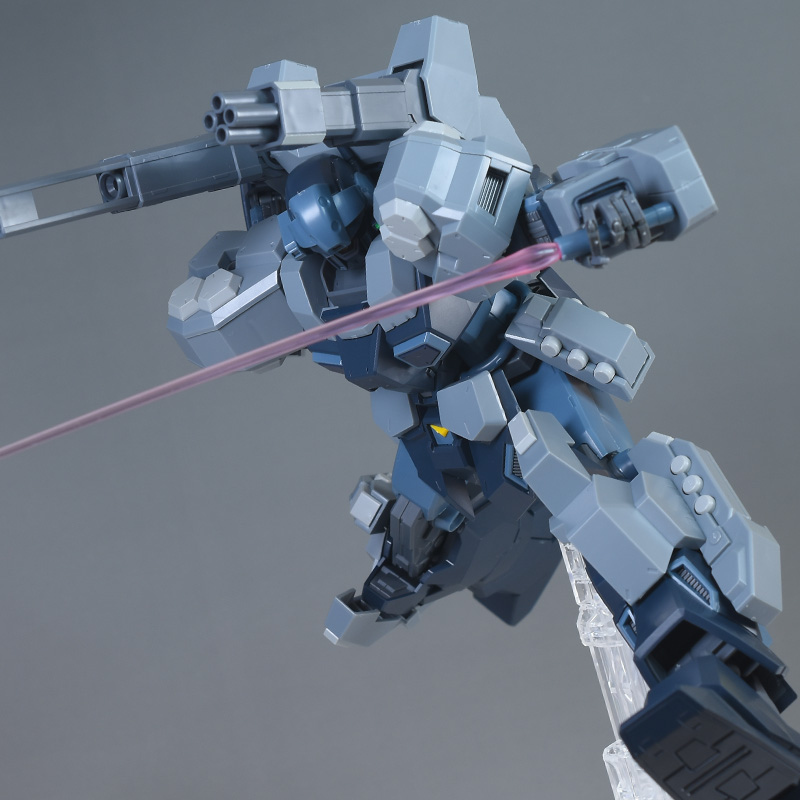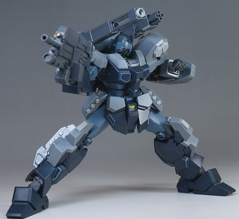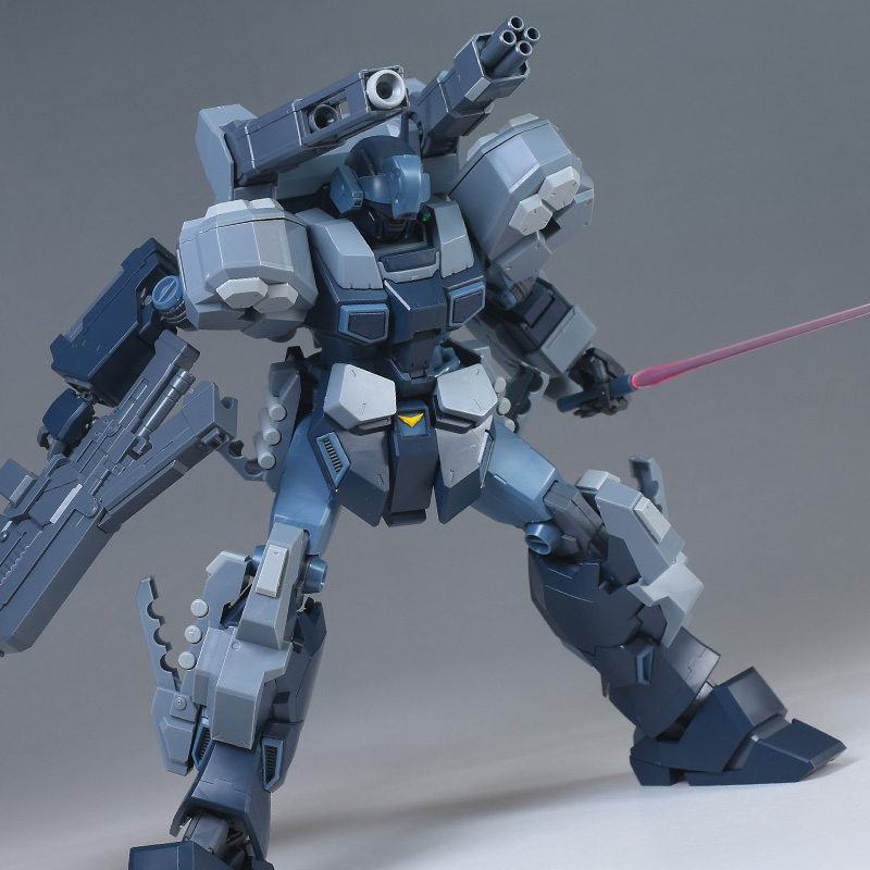 MGの中でも比較的大きめのキットなのと、各部増加装甲や肉厚のビーム・ライフルを装備しているため、シンプルにポーズを付けて飾るだけでもバツグンの存在感を発揮します。ジェスタと同様、ミリタリー要素も強く、特殊部隊感がうまく表現されていて良いですね。