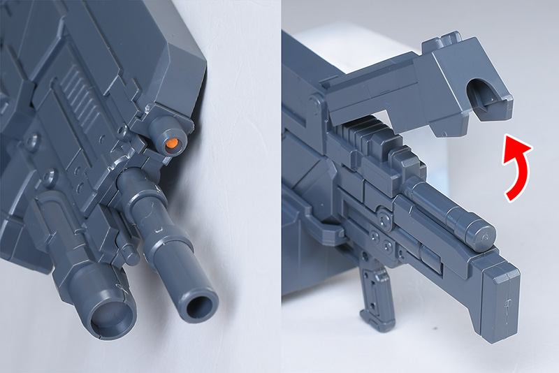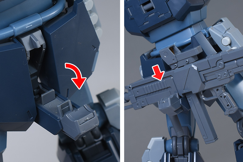 リアアーマー中央のラッチを展開することで、ジェスタ用のビーム・ライフルをマウントすることができます。ジェスタ・キャノンのビーム・ライフルは肉厚で干渉するため、マウントすることはできません。