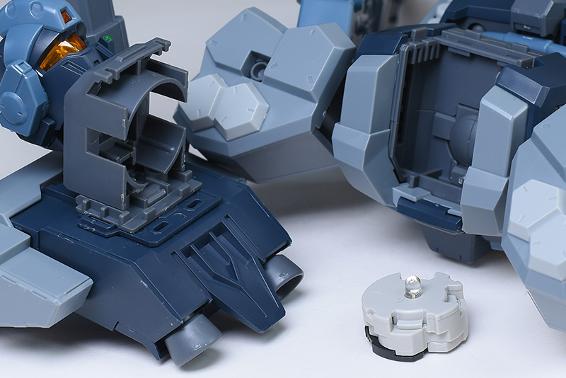 襟のパーツを頭部とバックパックごと取り外すことで、内部にLEDユニット(別売)を内蔵することができます。LEDユニット(赤)が推奨されていますが、他の色を組み込むこともできます。