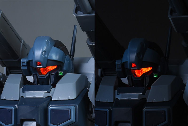 LEDユニット(赤)を組み込んで発光状態を確認。バイザーとヘッドギアのセンサーのみの発光ですが、暗闇の中、MSが起動している様子がリアルに表現されます。
