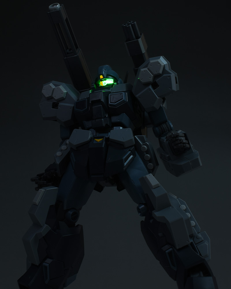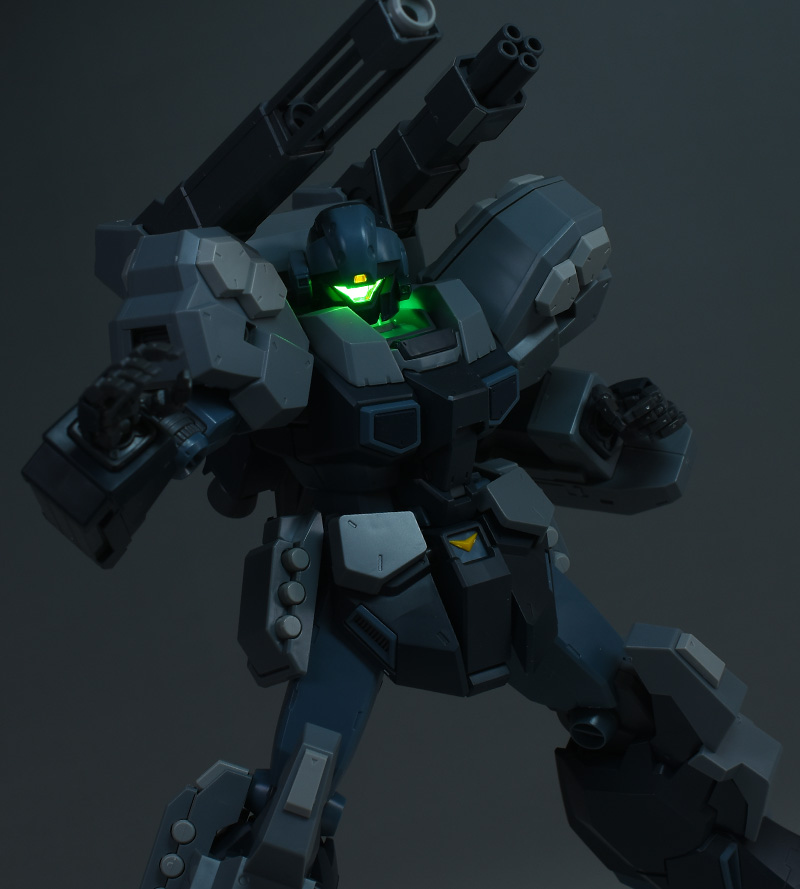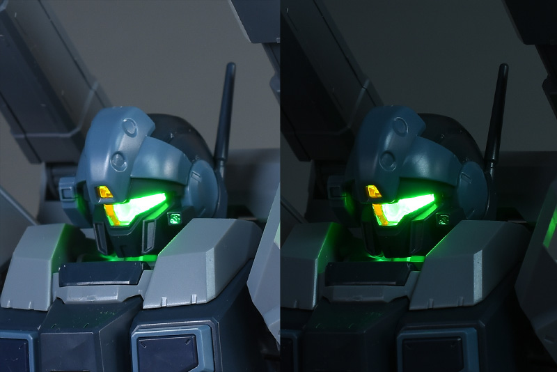 LEDユニット(グリーン)(別売)を組み込んで。ユニットの影響でバイザーがグリーンに変化するため、印象がガラッと変わります。グリーンに発光させるとこれほどまでに格好良くなるとは以外でした♪ちょっとガンキャノン・ディテクターっぽさが出るかも。