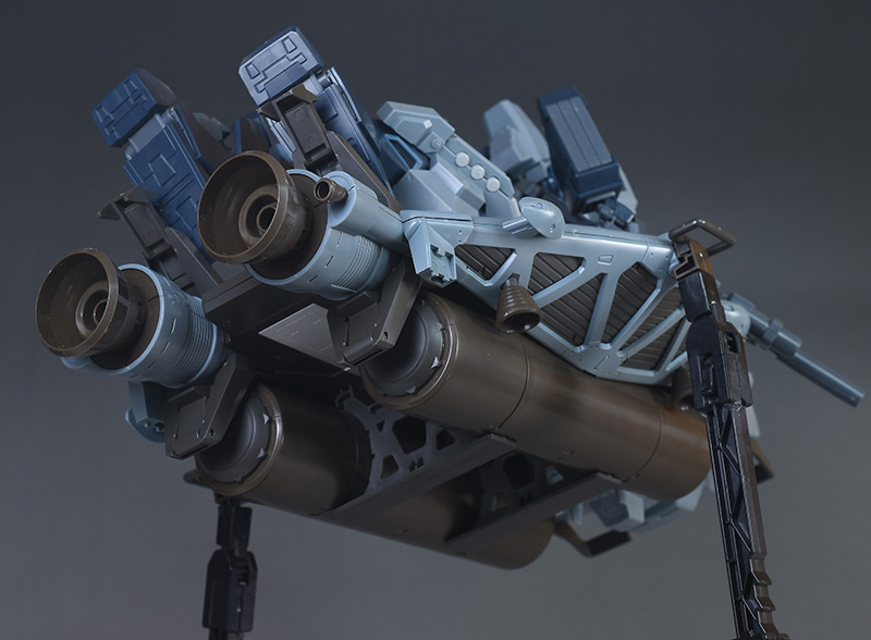 4連マルチ・ランチャー。バックパック左側に装備する4連装の実弾砲です。多目的対MS弾発射装置で、戦況に応じて閃光弾等の特殊砲弾も発射可能とのこと。