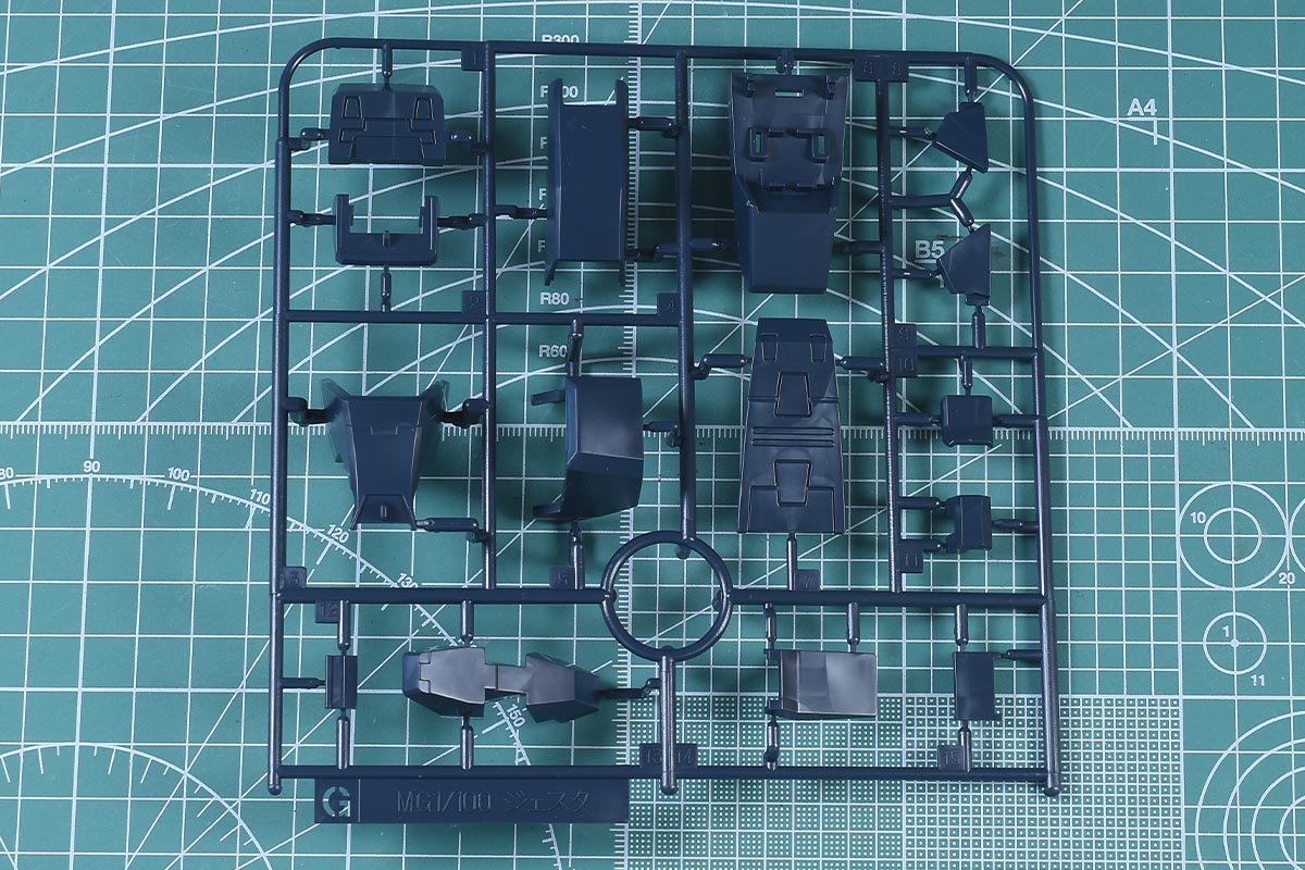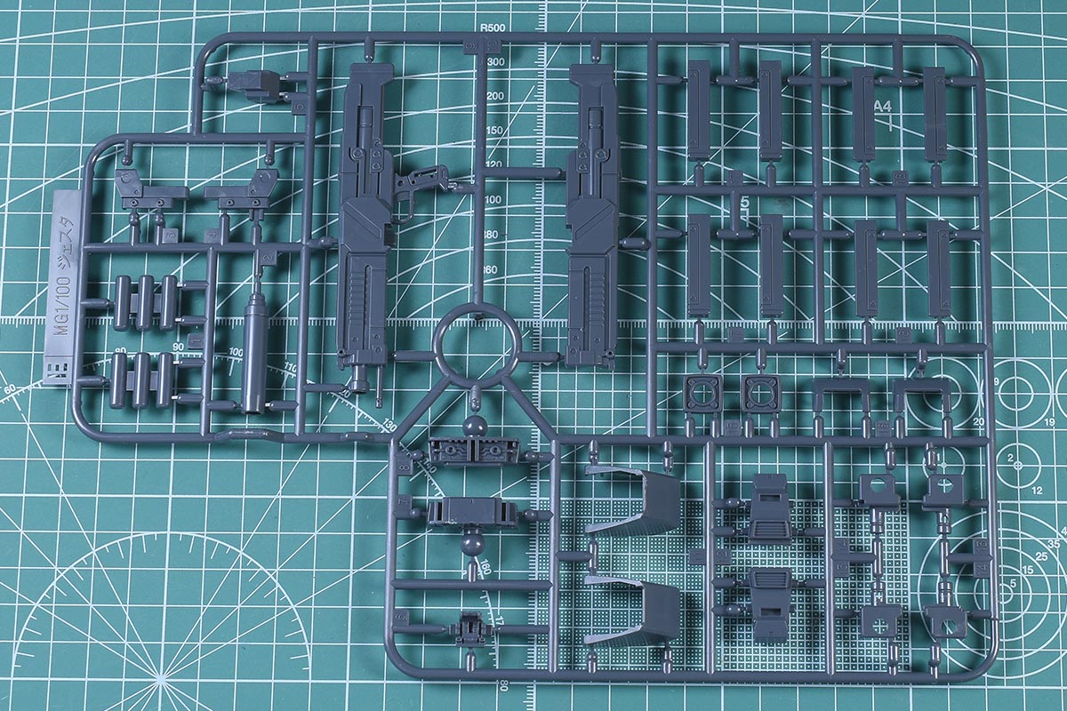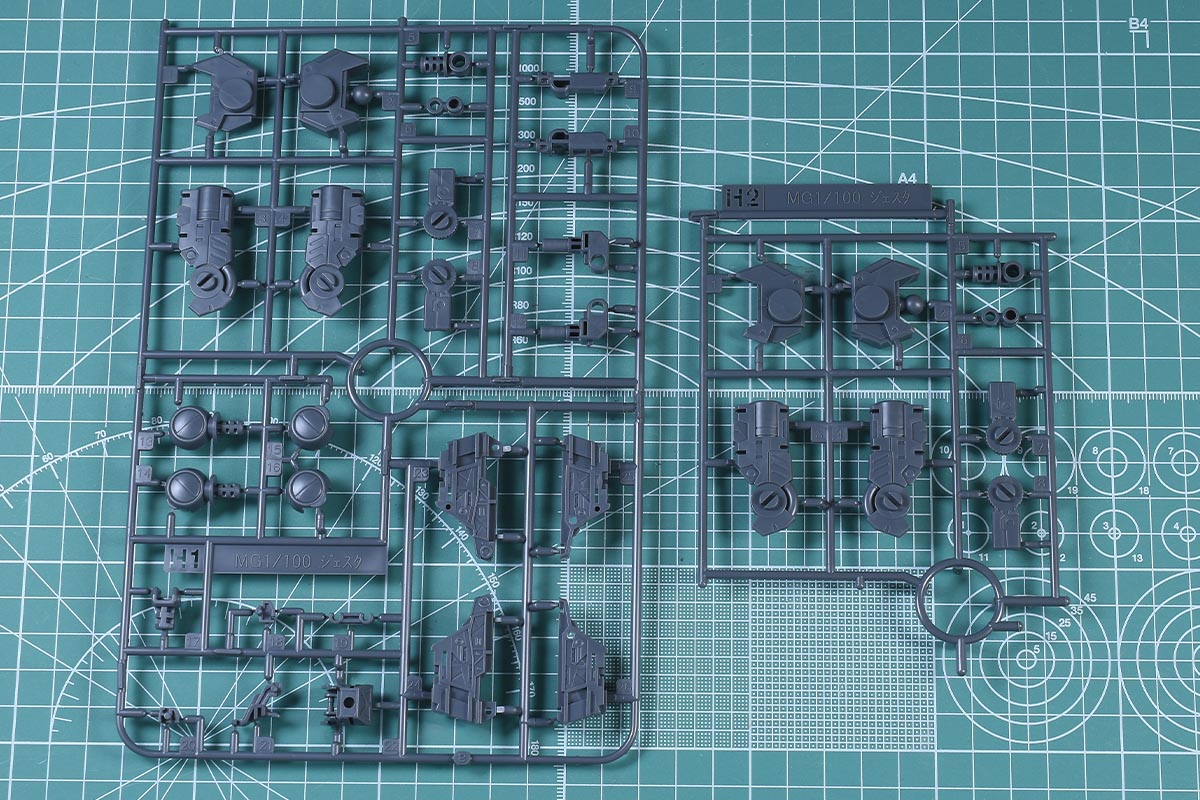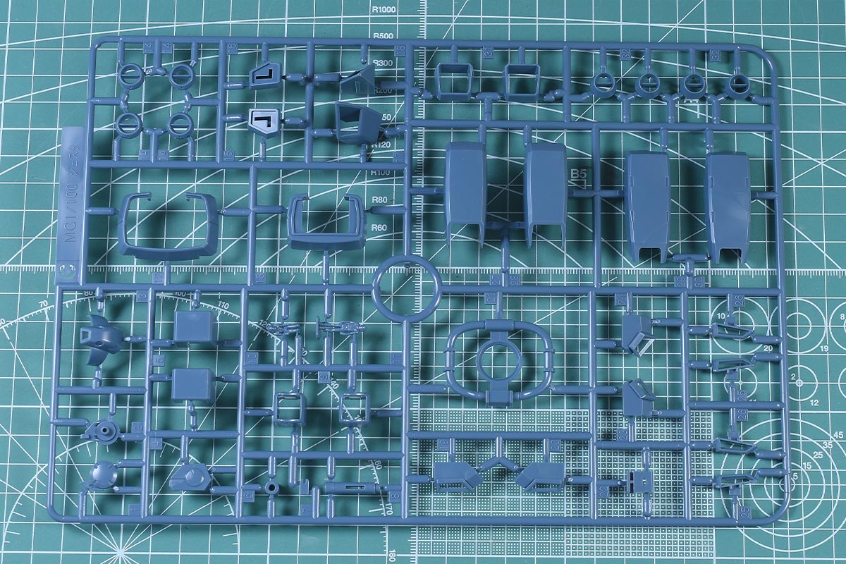 ↑Jランナー。グレー、ブルーグレー、ライトグレー、ダークブルーのイロプラランナーで、胸部や肩部、前腕部、腰部などの増加装甲、背部ビーム・キャノン、4連マルチランチャーパーツ、ビーム・ライフルパーツなど。MGジェスタ・キャノン用の新規ランナーです。