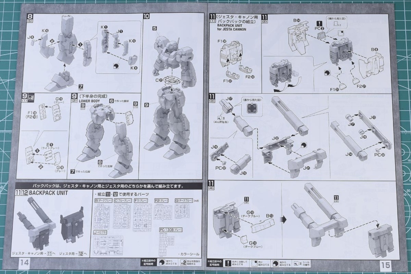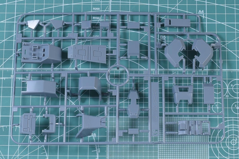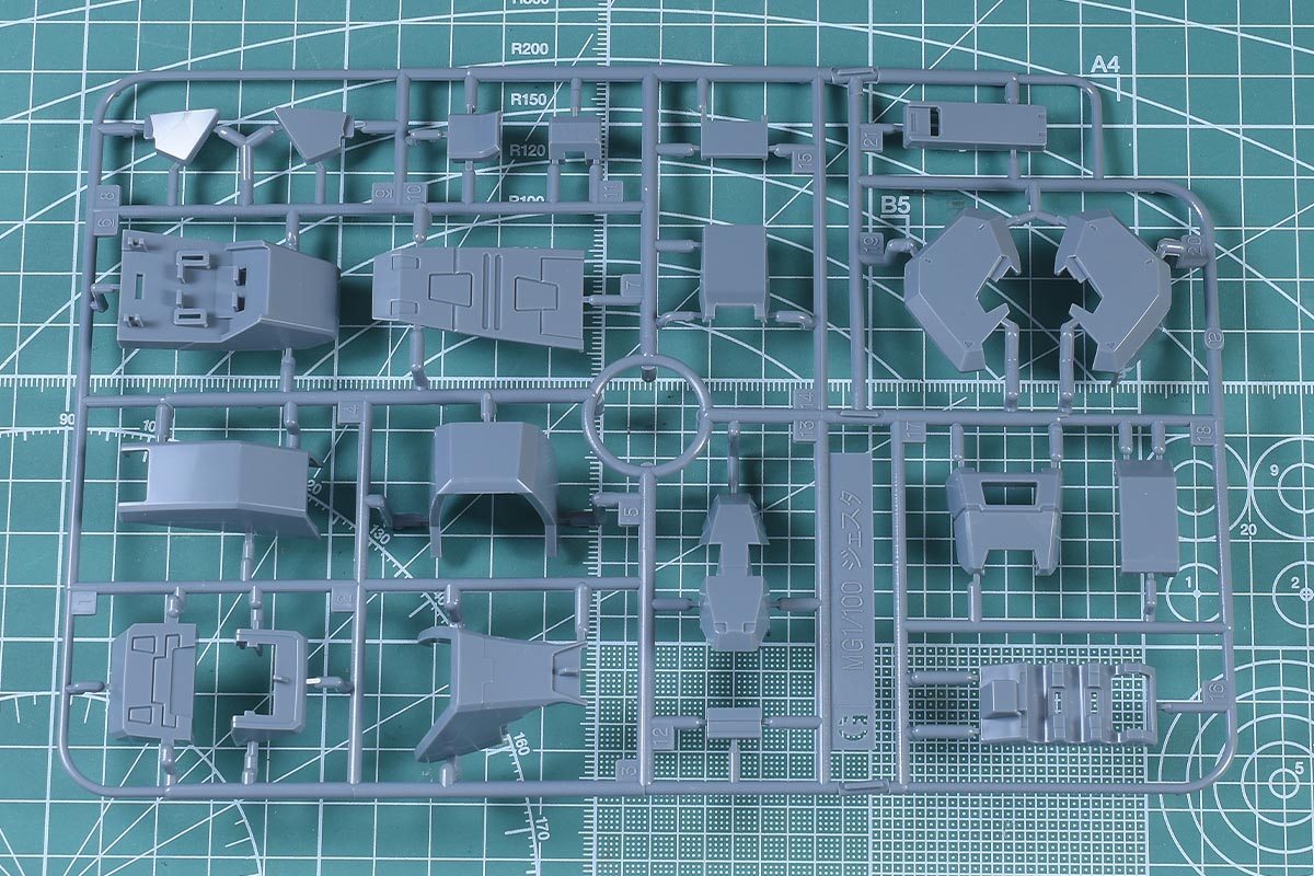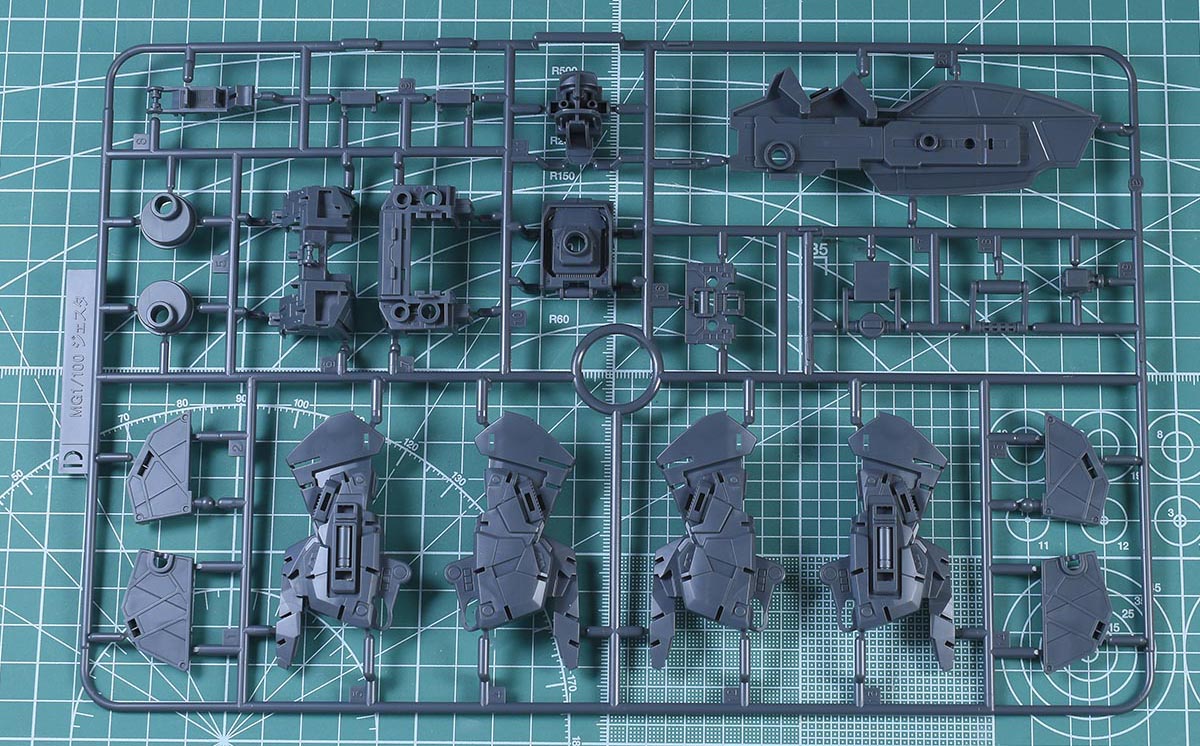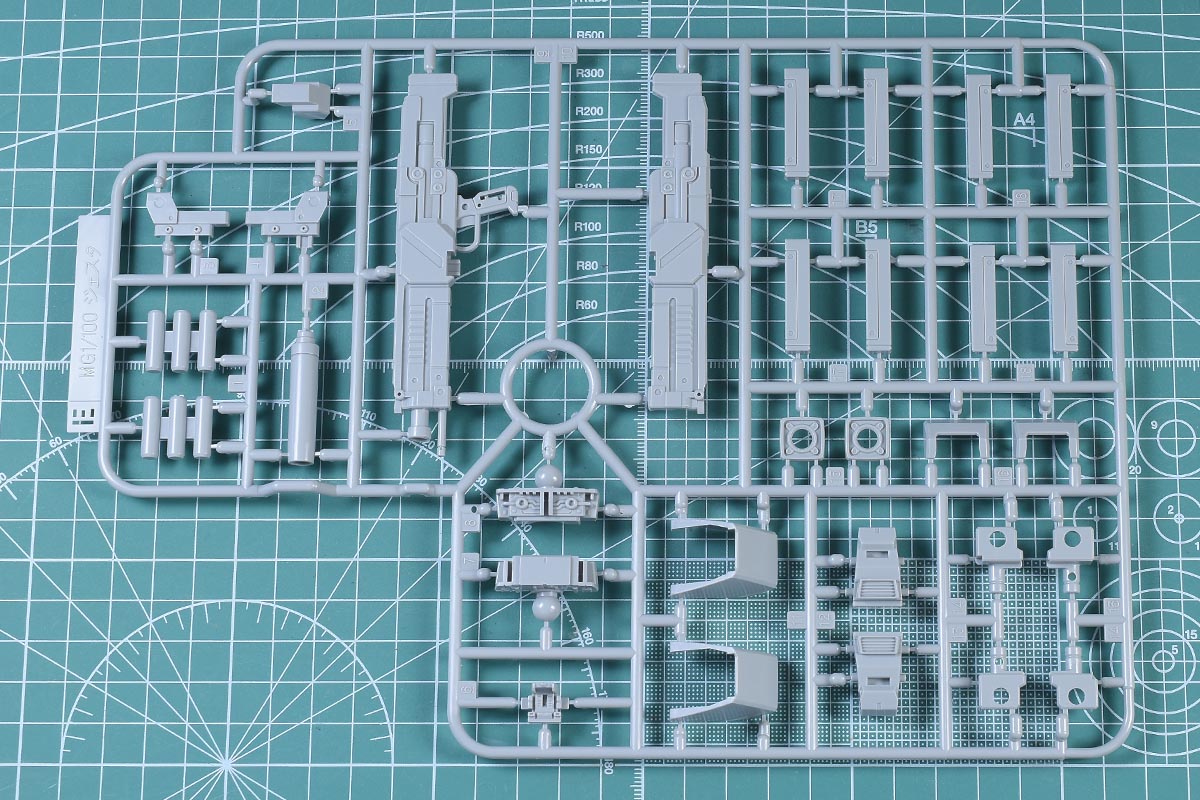 ↑Jランナー。グレー、ブルーグレー、ライトグレー、ダークブルーのイロプラランナーで、胸部や肩部、前腕部、腰部などの増加装甲、背部ビーム・キャノン、4連マルチランチャーパーツ、ビーム・ライフルパーツなど。MGジェスタ・キャノン用の新規ランナーです。