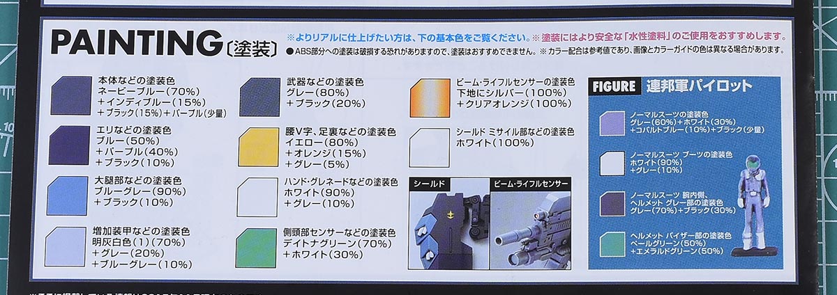 カラーガイド。色種、調色共にまずまずといったところです。何気に塗装することで厚みがでるため、関節の弱さやエモーションマニピュレーターSPのポロリなどが解消される場合もあります。なので塗装で補強するというのもある意味ありですね。
