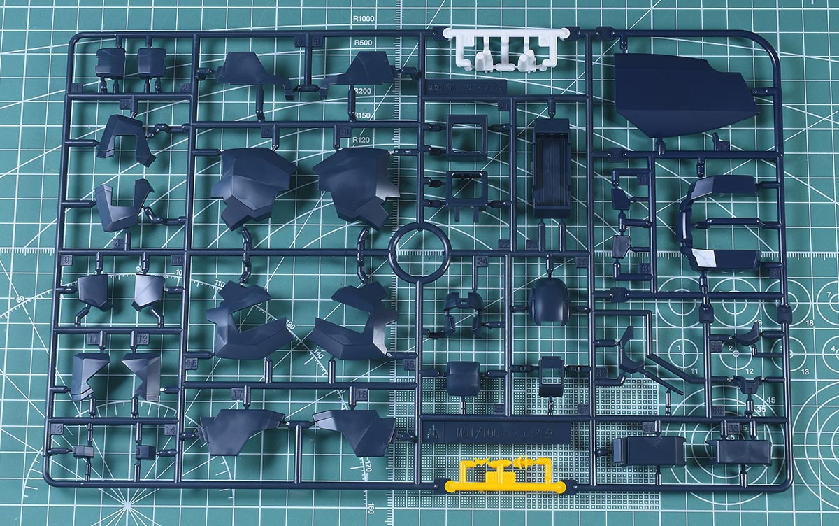 ↑Aランナー。ダークブルー、イエロー、ホワイトのイロプラランナーで、頭部や胴体部、腕部、脚部外装パーツ、シールドパーツなど。以下、しばらくMGジェスタからの流用ランナーです。