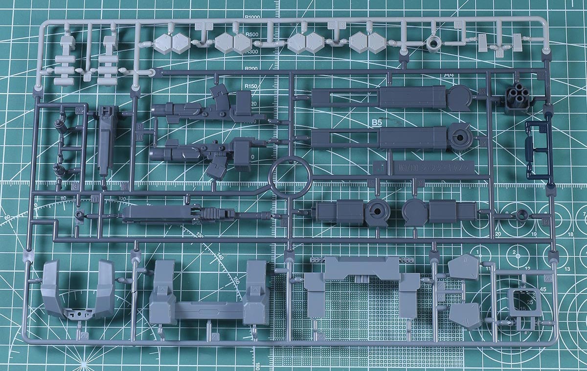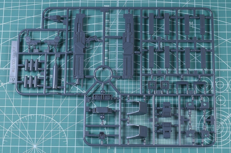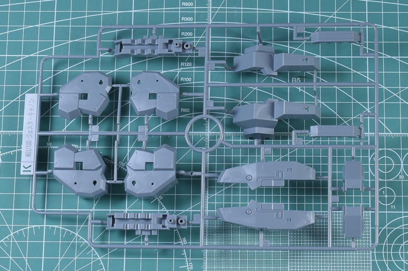 ↑Kランナー。グレー成形色で、肩部や前腕部、脚部の増加装甲、グレネード・ランチャーパーツ。MGジェスタ・キャノン用の新規ランナーです。