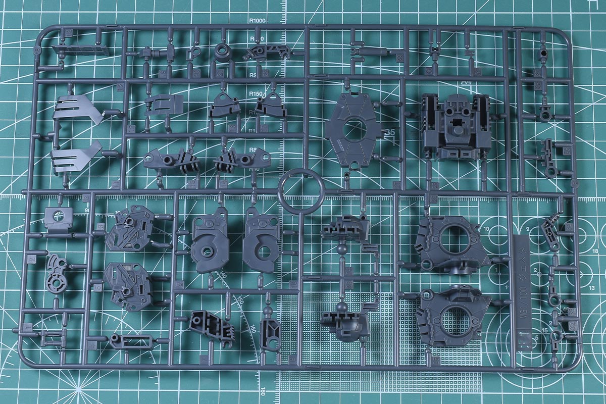 ↑F1、F2ランナー。グレー成型色で、胴体部や腕部、脚部、バックパックの内部フレームパーツ。KPS素材です。