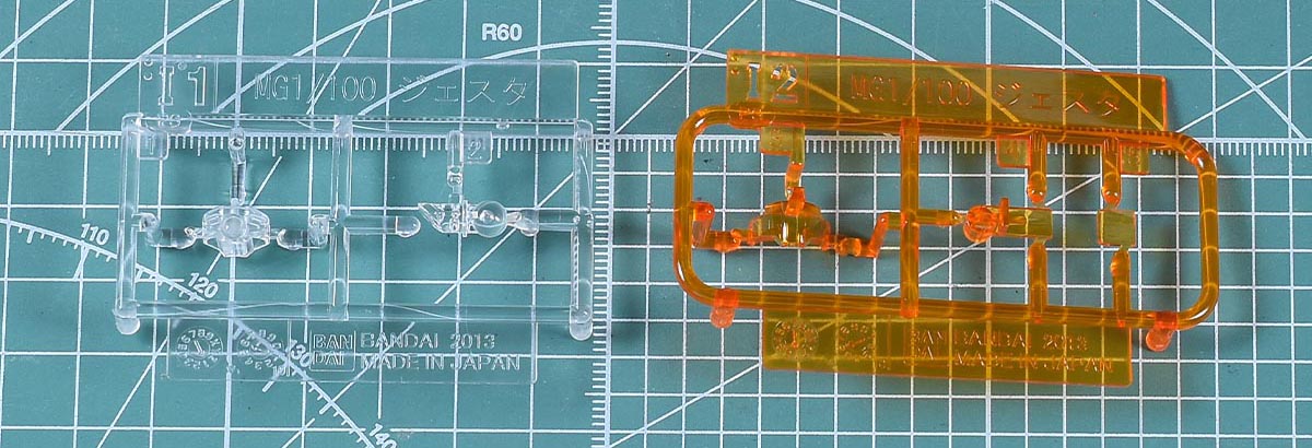 ↑I1、I2ランナー。I1はクリア成形色で、頭部センサーと首のボールジョイントパーツ。I2はクリアオレンジ成形色で、頭部バイザーやビーム・ライフルなどのセンサーパーツです。