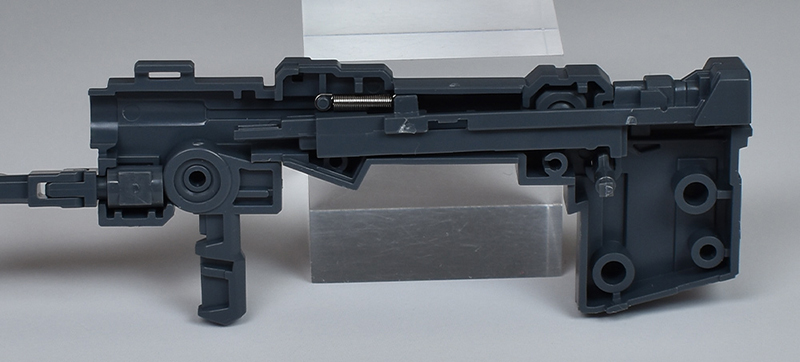 内部にはバネが仕込まれているため、砲身を押し込むことで後部の弾倉が押し出されるようになっています。下部のフックも上下にスイング可能。