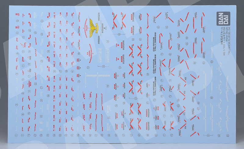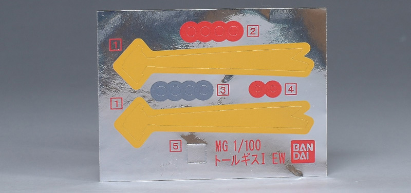 MGトールギスEW用のホイルシールが付属しますが、頭部センサーと一部丸モールドを補うくらいでわずか。その他のシールは使用しません。ウイングバインダーの丸モールドなど一部を塗り分ける必要がありますが、素組みでも塗装見本と遜色がないくらいの色分けが再現されています。
